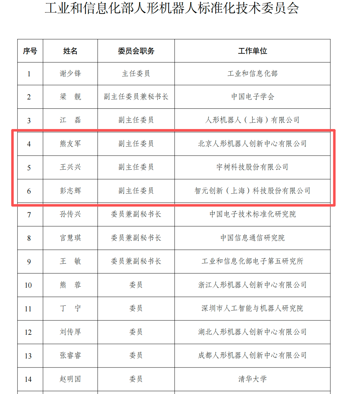 工业和信息化部11月24日公示人形机器人标准化技术委员会委员名单。名单显示,宇树科技股份有限公司王兴 兴、智元创新(上海)科技股份有限公司彭志辉等为副主任委员。 | 31 | 李 F | 委员 | 国家工业信息安全发展研究中心 | | --- | --- | --- | --- | | 32 | 童 建 | 委员 | 中国电子技术标准化研究院 | | 33 | 陈 相 | 委员 | 工业和信息化部电子第五研究所 | | 34 | 朱 浩 | 委员 | 中国工业互联网研究院(工业和信息化部密码应用研究中心) | | 35 | 王昆仑 | 委员 | 中国电子学会 | | 36 | 郑恩吴 | 委员 | 中国科学院自动化研究所 | | 37 | 刘连庆 | 委员 | 中国科学院沈阳自动化研究所 | | 38 | 江大勇 | 委员 | 中国科学院软件研究所 | | 39 | 范 超 | 委员 | 中国电子科技集团公司第四十三研究所 | | 40 | 焦维超 | 委员 | 深圳市优必选科技股份有限公司 | | 41 | 陈建宇 | 委员 | 北京星动纪元科技有限公司 | | 42 | 王 鹤 | 委员 | 北京银河通用 ...