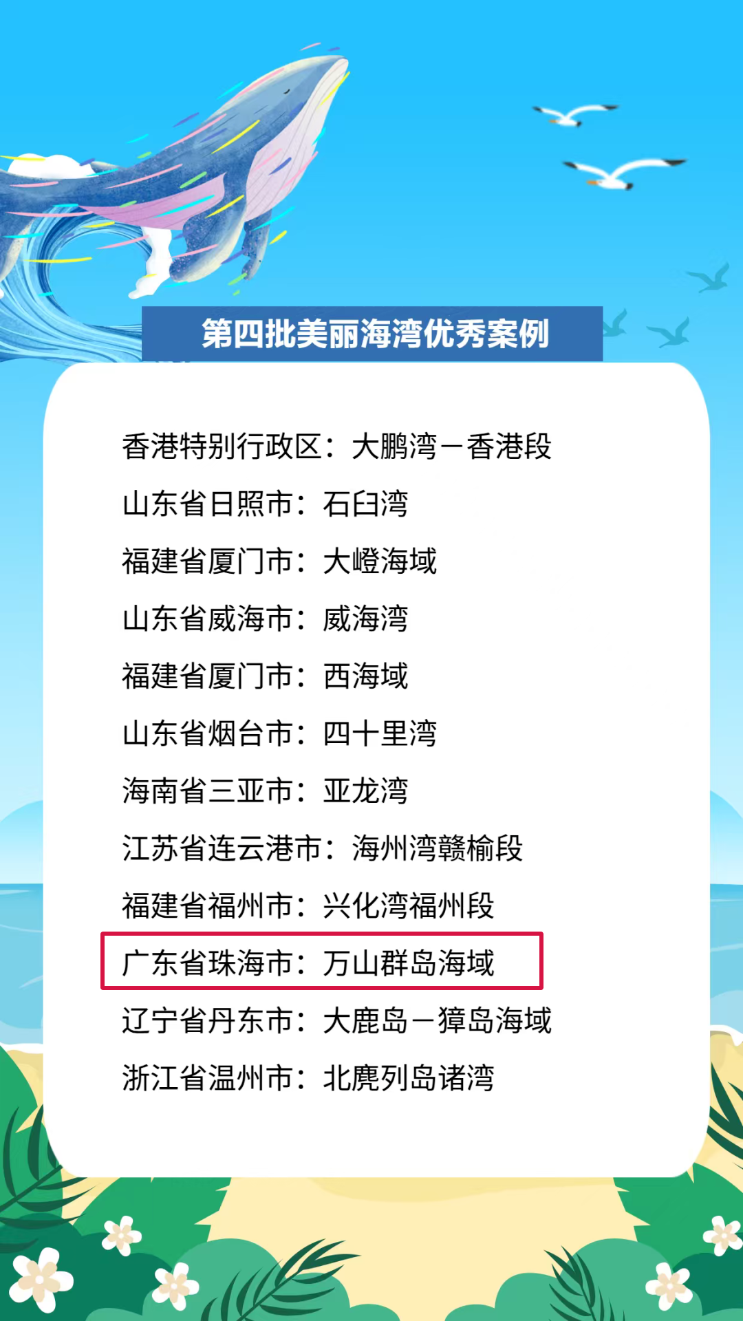 珠海万山群岛入选全国美丽海湾优秀案例 - 珠海市万山群岛海域成功入选第四批全国美丽海湾及优秀案例名单,标志着其在近岸海域污染防治、生态保护修复和岸滩环境整治方面取得的系统性成效获得国家级认可,成为粤港澳大湾区海洋生态文明建设的生动典范 [1] 入选案例名单概览 - 第四批全国美丽海湾优秀案例包括广东省珠海市的万山群岛海域、福建省福州市的兴化湾福州段、辽宁省丹东市的大鹿岛一獐岛海域、浙江省温州市的北唐列岛诸湾等 [3] - 第四批美丽海湾完整名单覆盖辽宁、江苏、浙江、福建、山东等多个沿海省份的多个湾区,例如辽宁省大连市的大连湾湾区、江苏省连云港市的海州湾赣榆段、浙江省宁波市的象山东部诸湾、福建省厦门市的大岭海域和西海域、山东省威海市的威海湾等 [4][5] 万山群岛的定位与治理模式 - 在最新一批美丽海湾中,珠海万山群岛海域是亲海宜居的代表 [7] - 万山群岛由147座岛屿组成,海域面积4500平方公里,近年来珠海持续实施“从山顶到海洋”的全链条治理,打造主题特色海岛 [9] - 形成了“岛链串珠、碧海金沙”的独特景观,并推行“一岛一品”发展策略,差异化打造海岛功能 [10] 具体发展策略与项目 - **桂山岛**:聚焦人文资源挖掘与保护,风情建筑和渔村风格混搭,将蚝壳嵌在民宿外墙以保留文化特色 [10] - **三角岛**:是全国首个以生态修复为主题进行整岛开发的无居民海岛,岛上因采石活动被破坏的矿湖已重现清澈,未来将为生态研学、休闲观光等旅游项目提供独特空间 [10] - **智能化养殖**:万山群岛引入智能化养殖技术提升海洋养殖效率与环保水平,例如伶仃洋海域的“伶仃牧场1号”智能化养殖平台,通过实时监测与自动化操作实现养殖全流程科学管控 [10] 模式总结与影响 - 万山群岛从生态修复到科技赋能,从陆海统筹到“一岛一品”,绘就出人与自然和谐共生的画卷,为沿海地区实现“人海和谐”提供了可借鉴的“珠海经验”与“万山方案” [10]