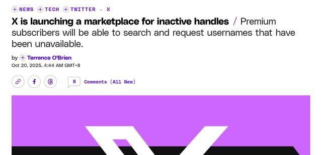 来源:环球网 【环球网科技综合报道】10月20日消息,据The Verge报道,X平台近日宣布将为Premium Plus与 Premium Business两类订阅会员,上线"靓号用户名交易市场"。该服务允许符合条件的会员支付相应费 用,申请获取平台内被"长期未使用"账号占用的靓号用户名,引发广泛关注。 根据平台官方介绍,此次推出的靓号用户名分为两大类别。一类是"普通优先类(Priority Handles)", 该类别免费向会员开放,涵盖"真实姓名""多词组短语""字母数字组合"等常见形式的用户名。另一类 是"稀有类(Rare Handles)",此类用户名需付费购买,起步价格为2500美元,最高定价可超过100万美 元,具体价格将根据用户名的稀有程度与市场需求动态确定。 值得注意的是,X平台明确表示,此次靓号服务并非"一次性买断"模式,而是平台吸引用户长期订阅付 费服务的运营机制。会员成功获取新靓号后,其原有用户名会被冻结,避免被他人抢注;平台还计划在 未来推出付费"用户名跳转"附加功能,实现旧账号向新靓号的自动重定向,提升用户使用便利性。 同时,平台也制定了相应的使用规则:若用户取消订阅,或将会员等级 ...