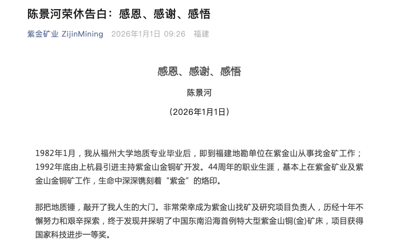 紫金矿业发展历程与成就 - 公司创始人陈景河于2026年荣退,其44年职业生涯将一家县属小企业发展为世界500强、全球金属矿企前列的巨头,旗下三家上市公司市值合计超1.4万亿元 [1][3] - 创始人持股不足1%,退休时主动交棒,承诺只提建议不做决策,体现了老一辈企业家“功成身退”的格局 [3] - 公司于2003年在香港H股上市,募集资金12亿港元,开始面向全国发展 [10] - 公司于2008年在上海A股上市,募集资金98亿元 [9] - 公司发展经历了多个战略阶段:2002年实现“国内黄金行业领先”的第一步目标并开始向海外投资 [10],2018年实现“国内金属矿业行业领先”的第二步目标 [9],并提出了成为“绿色高技术超一流国际矿业集团”的战略目标 [7] 紫金矿业重大收购与项目(2015-2023年) - **2015年**:收购巴理克(新几内亚)有限公司50%股权和50%债权,收购刚果(金)卡莫阿控股公司49.5%股权 [9] - **2017年**:完成多宝山铜矿100%权益收购 [8] - **2018年**:收购塞尔维亚BOR铜业公司63%股权,收购塞尔维亚Timok铜(金)矿上带矿100%权益、下带矿60.4%权益 [8] - **2019年**:全面收购塞尔维亚Timok铜(金)矿上、下带矿100%权益,收购圭亚那奥罗拉金矿100%权益 [8] - **2020年**:收购武里蒂卡金矿69.28%股权,收购巨龙铜业50.1%权益 [7] - **2021年**:收购招金矿业20%股权及海域金矿30%权益(合计持有海域金矿44%权益) [7] - **2022年**:收购苏里南罗斯贝尔金矿95%权益 [6] - **2022-2023年(锂资源布局)**:收购阿根廷3Q锂盐湖100%权益,收购拉果错盐湖锂矿70%权益,收购湖南道县湘源硬岩锂矿66%权益,受邀主导刚果(金)马诺诺锂矿东北部勘探开发 [5][7] - **2023年**:收购龙净环保控制权(15.02%权益),收购蒙古哈马戈泰铜金矿45.7%权益,收购朱诺铜矿48.591%权益,收购秘鲁阿瑞那铜金矿100%权益 [5][7] 公司战略规划与可持续发展 - 公司发布了五年(2+3)规划和2030年发展目标纲要,提出了未来十年发展的三个阶段目标 [7] - 在公司30周年之际,公告了三年(2023-2025年)规划和2030年发展目标纲要 [5] - 公司发布应对气候变化行动方案,争取2029年实现碳达峰、2050年实现碳中和 [5] - 公司修订了紫金文化理念体系 [5] - 公司于2011年首次发布企业社会责任(CSR)报告 [9] 中国企业家代际更替与产业变迁 - 以陈景河、王石为代表的老一代企业家大多从体制内走出,在改革开放浪潮中成长,撑起了中国实体经济的半壁江山,他们的退休标志着一个时代的交接 [15] - 科技互联网领域的代际更替速度更快,从21世纪初的三大门户(新浪、网易、搜狐),到后来的BAT(百度、阿里、腾讯),再到如今的TMD(字节跳动等)接棒 [15] - 字节跳动(TikTok)已成为真正具有世界级影响力的中国企业,其在AI领域的布局广度被认为是世界之最 [15] - 以“杭州六小龙”为代表的新一代创业者正在崛起,例如宇树机器人(登上春晚舞台)和强脑科技(深耕脑机接口),他们成长于互联网与AI时代,赛道更前沿,视野更全球化 [16][18][20] 行业趋势与论坛议题演变 - 亚布力论坛走过25年,议题从讨论PC互联网普及,演变到2026年年会讨论“碳基生物与硅基生物的对决”、人形机器人是否会取代人类劳动、以及马斯克预言的“能源定价时代” [20] - 代际更替伴随挑战,新一代年轻人对传统制造业兴趣不足,倒逼传统企业必须转型并拥抱科技(如AI、新能源)才能完成传承 [20] - 从实体经济的深耕,到互联网的爆发,再到硬科技的突围,体现了中国经济的脉络变迁 [20]
