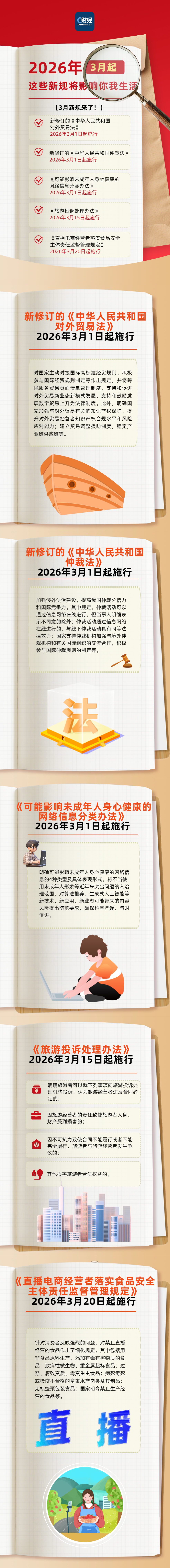 网络信息内容与未成年人保护新规 - 对可能影响未成年人身心健康的网络信息进行分类管理[1] - 明确可能影响未成年人身心健康的网络信息分为4种类型并规定具体表现形式[6] - 将不当使用未成年人形象等突出问题纳入治理范围[6] - 对算法推荐、生成式人工智能等新技术应用带来的内容风险提出防范要求[6] - 该规定将于2026年3月1日起施行[5] 直播电商与食品安全监管新规 - 规定过期食品、腐败变质食品、霉变生虫食品等禁止通过直播间售卖[1][9] - 禁止直播经营的食品包括用非食品原料生产、添加有毒有害物质的食品[9] - 禁止直播经营的食品包括致病性微生物、重金属超标食品[9] - 禁止直播经营的食品包括病死毒死或检疫不合格的畜禽水产肉类及其制品[9] - 禁止直播经营的食品包括无标签预包装食品及国家明令禁止生产经营的食品[9] - 该规定针对消费者反映强烈的问题作出了细化规定[9] - 相关规定将于2026年3月20日起施行[3][8] 对外贸易与涉外法治建设新规 - 新修订的《中华人民共和国对外贸易法》将于2026年3月1日起施行[3] - 新法对国家主动对接国际高标准经贸规则、积极参与国际经贸规则制定等作出规定[3] - 将跨境服务贸易负面清单管理制度上升为法律制度[3] - 将支持和促进对外贸易新业态新模式发展上升为法律制度[3] - 将支持和鼓励发展数字贸易上升为法律制度[3] - 明确国家加强与对外贸易有关的知识产权保护 提升对外贸易经营者知识产权合规水平和风险应对能力[3] - 建立贸易调整援助制度 以稳定产业链供应链[3] - 新修订的《中华人民共和国仲裁法》将于2026年3月1日起施行[4] - 规定仲裁活动可以通过信息网络在线进行 与线下仲裁活动具有同等法律效力[4] - 国家支持仲裁机构加强与境外仲裁机构和有关国际组织的交流合作 积极参与国际仲裁规则的制定[4] - 旨在加强涉外法治建设 提高中国仲裁公信力和国际竞争力[4] 旅游消费权益保护新规 - 《旅游投诉处理办法》将于2026年3月15日起施行[7] - 明确旅游者可以就认为旅游经营者违反合同约定的事项向旅游投诉处理机构投诉[7] - 明确旅游者可以就因旅游经营者的责任致使旅游者人身、财产受到损害的事项进行投诉[7] - 明确旅游者可以就因不可抗力致使合同不能履行发生争议的事项进行投诉[7] - 明确旅游者可以就其他损害旅游者合法权益的事项进行投诉[7]