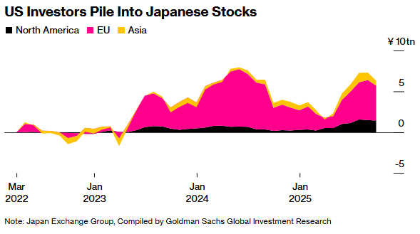美国资金流入日本股市 - 受日本股市相对美股的超高回报吸引,美国投资者正越来越多地买入聚焦科技和人工智能领域的日本股票 [1] - 美国资金流入的增速现已达到“安倍经济学”以来的最快水平,美国投资者对日本股市的主动参与度处于2022年10月以来的最高水平 [1] - 美国投资者参与度提升的意义重大,他们往往倾向于科技和人工智能相关主题 [1] 日本股市表现与驱动因素 - 今年以美元计价的基准日经225指数上涨约30%,远超标准普尔500指数14%的涨幅 [1] - 日元升值2.5%,加上首相高市早苗的刺激政策引发新的乐观情绪,为日本股市提供了支撑 [1] - 市场驱动力可能从价值股转向成长型股票,价值股自2021年起已连续四年跑赢成长股 [1] 外资流入趋势与前景 - 相比“安倍经济学”时期的峰值,全球投资者对日本股票的净持仓仍较低,留有进一步买入的空间 [3] - 全球投资者持续的多元化配置需求可能会维持资金流入趋势 [3] - 10月最后两周,外国投资者通过现金和期货市场净买入3840亿日元(约合25亿美元)的日本股票 [3] 市场技术面观察 - 鉴于日经指数在10月下旬进入超买区间,若市场出现盘整,不会令人意外 [3]