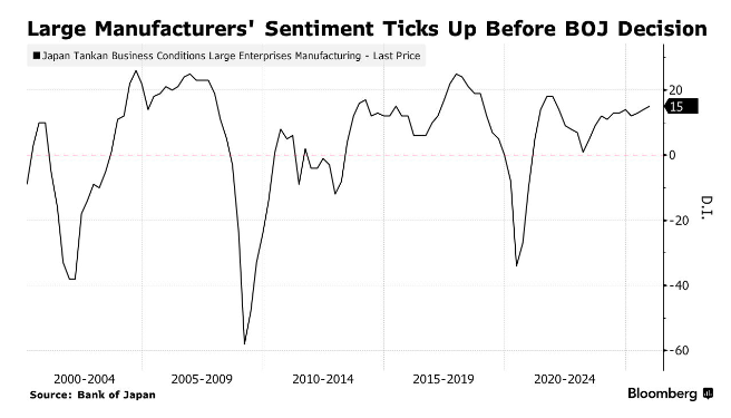 日本大型制造业信心指数攀升至四年高点,进一步强化了市场对日本央行本周加息的预期。 日本央行周一发布的季度短观(Tankan)调查报告显示,12月大型制造业景气指数从9月的14升至15,与 经济学家的预期中值一致。大型非制造业景气指数维持在34,接近1990年代初以来的最高水平。该指数 为正值表明认为经营状况"良好"的企业数量多于"欠佳"的企业。 作为日本央行最受关注的数据之一,短观调查表明日本企业迄今未受美国关税政策的显著冲击——这正 是央行数月来持续强调的不确定性来源。此次调查结果增强了行长植田和男领导的政策委员会在周五加 息的理由,若实施将是今年1月以来的首次加息。 数据显示,石油和煤炭产品制造商的信心有所改善,为央行提供了观察企业如何应对9月中旬美国降关 税政策的早期窗口。约有70%的企业在此次关税调整前已提交了上一轮调查回复。 持续疲软的日元继续利好出口企业,但同时推高了服务业企业的运营成本——该行业吸纳了日本大部分 劳动力。根据周五数据,企业预计本财年日元兑美元汇率为147.06,较9月预测的145.68进一步走弱。 植田行长曾多次强调,美国关税政策的不确定性及薪资谈判的初步进展,将是当局考虑下一次 ...