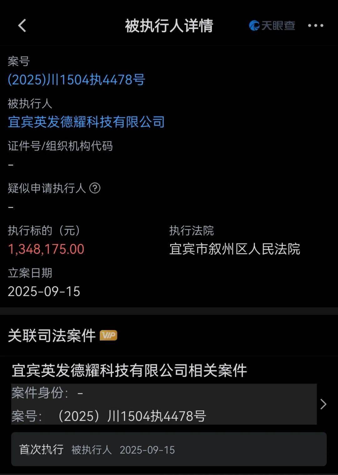 被执行人详情 案号 (2025)川1504执4478号 被执行人 宜宾英发德耀科技有限公司 证件号/组织机构代码 l 疑似申请执行人 2 I 执行标的(元) 执行法院 1,348.175.00 宜宾市叙州区人民法院 立案日期 2025-09-15 关联司法案件 VIP 宜宾英发德耀科技有限公司相关案件 案件身份: - 案号: (2025) 川1504执4478号 首次执行 被执行人 2025-09-15 英发睿能港股上市前夕,子公司英发德耀成被执行人引关注! 近日,天眼查信息显示,宜宾英发德耀科技有限公司被宜宾市叙州区人民法院列为被执行人,执行标的134.8175万元,立案时间为2025年9月15日。 值得注意的是,宜宾英发德耀是四川英发睿能科技股份有限公司(注意此处为"睿")的子公司,而英发睿能正处于港股上市的关键申报阶段。从股权结构 看,英发睿能直接持有英发德耀73.3333%的股份,对其具有绝对控制权。 在企业冲刺港股的敏感节点,子公司出现被执行人记录,虽标的金额不算特别巨大,但仍可能引发市场对英发睿能内控管理、关联风险的审视。后续该事 件是否会对英发睿能的上市进程产生影响,我们将持续关注。 技术信示 ...