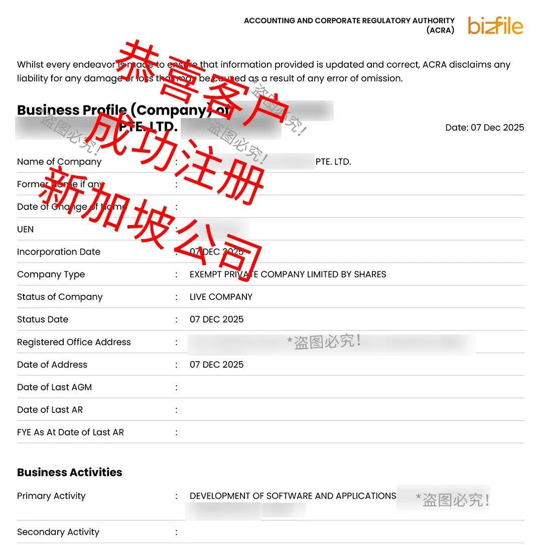 近日,专注于软件及应用程序开发的C公司宣布,其新加坡子公司已于2025年12月成功获得注册批准。 这不仅是一次海外布局,更是其以新加坡为战略枢纽,开启服务全球市场新征程的关键一步。 一、战略抉择:为何锚定新加坡? C公司选择新加坡作为全球化首站,是基于多重战略优势的考量。新加坡不仅是亚洲的金融与商业中心,更以其稳定的Z局、透明的法律体系和高效的ZF 服务闻名。 对C公司这类科技企业而言,新加坡充满活力的数字创新生态、对知识产权的严格保护,以及作为通往东南亚市场天然门户的地理位置,构成了强大的吸 引力。 此外,新加坡ZF持续推出利好政策,如经济发展局(EDB)专为吸引全球精英创业者设立的"全球创业者计划",为在新加坡建立高潜力企业的创始人提 供从签证到社群网络的全方位支持。这与C公司的国际化雄心高度契合。 二、极速启航:体验"BizFile+"高效注册 三、立享优势:奠定全球发展基石 C公司的注册过程高效顺畅,核心得益于新加坡会计与企业管制局(ACRA)全面数字化的官方平台"BizFile+"。 该平台集成了公司注册、申报和合规管理等所有服务,外国投资者通过在线流程,平均可在1~3天内完成公司注册。 整个过程体 ...