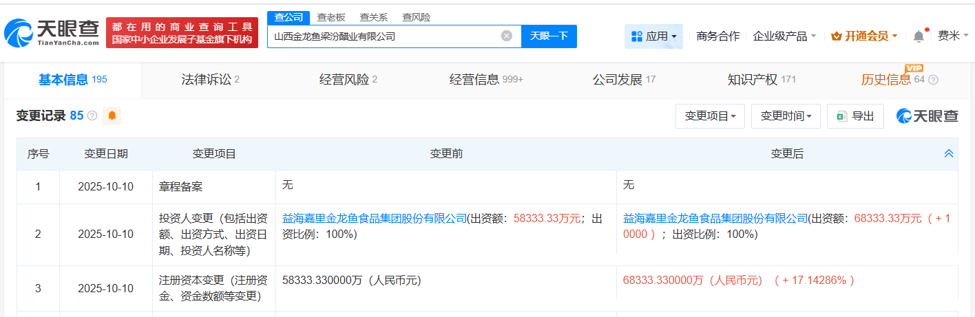 | ●大眼管 | 夏公司 都在用的商业查询工具 | 查老板 | | | | | | --- | --- | --- | --- | --- | --- | --- | | 国家中小企业发展子基金旗下机构 | | 山西金龙鱼梁汾酷亚有限公司 | (×) | 天眼一下 | 品应用▼ | 商务合作 : | | 基本信息 195 | 法律诉讼 2 | 经营风险2 | 经营信息 999+ | | 公司发展 17 | 知识 | | 股东信息 ② ● 品股权结构 VIP | VIP | | | | | | | 股东信息 1 | 历史股东信息 12 股权变更历程 13 2 | | | | | | | 序号 | 股东名称 | | | 持股比例 ÷ | 认缴出资额(万元) ۾ | 认缴出资 | | 1 1442 | 益海嘉里金龙鱼食品集团股份有限公司 品 | | | 100% | 68333.33 | 2025-0 | | 控股东 | A股(正常上市) 定向增发 | | | | | | 每经AI快讯,天眼查App显示,近日,山西金龙鱼(300999)梁汾醋业有限公司发生工商变更,注册资本由约5.8亿元增至约6.8亿元,增幅约17 ...