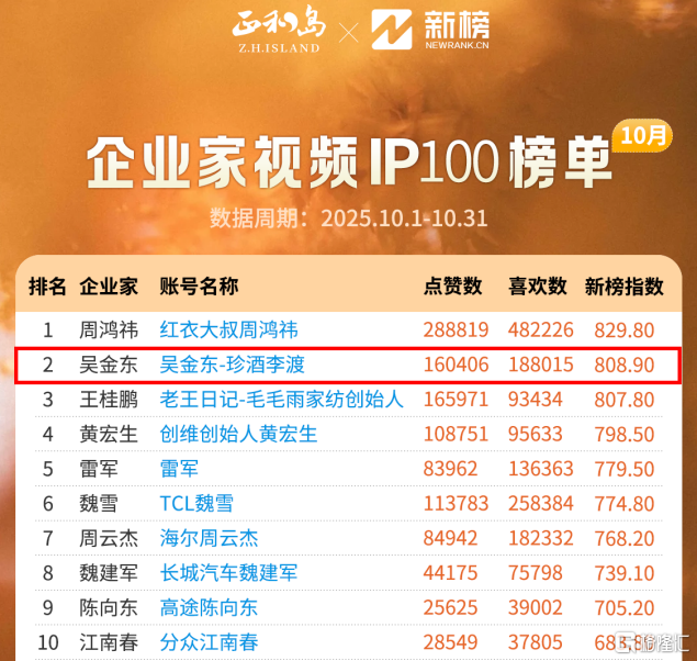 该榜单汇集了微信视频号平台表现最为突出的100位企业家,上榜者还包括360集团创始人周鸿祎、小米 集团创始人兼董事长雷军、创维集团创始人黄宏生、长城汽车创始人兼董事长魏建军、海尔集团董事局 主席周云杰等知名商业领袖。 吴向东今年7月正式开启个人IP打造,至今已在微信视频号发布视频百余条,总播放量突破2亿。其中, 4条短视频播放量超千万,单条最高超4000万。 近日,正和岛联合新榜发布《企业家视频IP100榜单(10月)》,珍酒李渡集团董事长吴向东凭借个人视 频号"吴金东—珍酒李渡"影响力登榜,位列第二。 | | | Z.H.ISLAND | 三十八 人 36年 | | | | --- | --- | --- | --- | --- | --- | | | | | | | 10月 | | 企业家视频 IP100 榜单 | | | | | | | | | 数据周期:2025.10.1-10.31 | | | | | 排名 企业家 账号名称 | | | 点赞数 | 喜欢数 新榜指数 | | | 1 | 周鸿祎 | 288819 红衣大叔周鸿祎 | | 482226 829.80 | | | 2 | 吴金东 | 吴金 ...