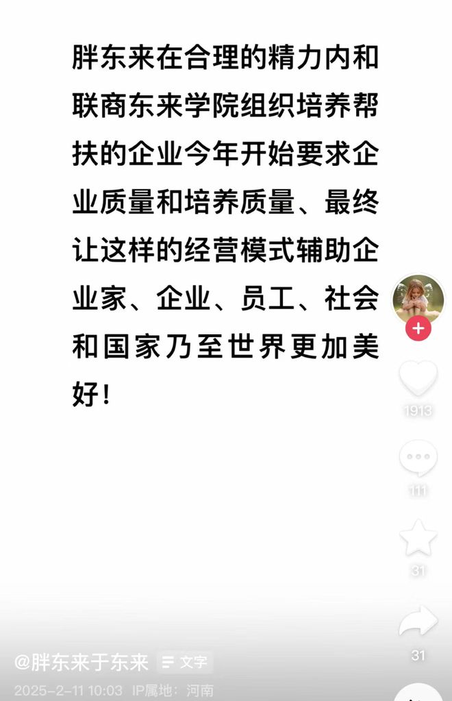 3月22日,胖东来创始人于东来在社交媒体上发文称,只要提高商品质量和管理质量,提升员工收入,就没有帮扶不好的企业。 对于已经帮扶调改的企业,于东来认为,这些企业各个方面己经有很大的改变,虽然经营管理服务品质肯定还存在很多问题,但商品的质量安全己经基本得 到保障。于东来认为,社会也要给他们时间进步,相信整个实体行业和电商行业依靠质量的进步一定会越来越好,人民的生活也一定会越来越健康和美好。 胖东来直接帮扶的调改企 业在各个方面已经有很大 的改变了、经营管理服务 品质肯定还存在很多问 题、但商品的质量安全己 经基本得到保障、社会也 要给他们时间进步、相信 整个实体行业和电商行业 依靠质量的进步一定会越 来越好!人民的生活也一 定会越来越健康和美好! EBZE 实体商业不好的问题在于 企业自身的专业经营管理 技术质量太低! 主要是对 人关心不到位、然后商品 质量和价格让顾客不放 心、大部分制造企业盲目 扩张、导致商品质量不 稳、价值管理混乱、导致 整个行业的严重内卷内 耗! 改变此现象一切都会越来 越好! 于东来还表示,胖东来会按照超市样板的规划,像学校一样分享给商业行业学习,并以此辅助推动国家商业行业质量的发展与 ...
