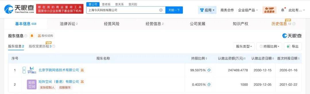 上海今风科技有限公司新增北京字跳网络技术有限公司为股东,注册资本增幅约24747% 投资时间网、标点财经快讯 天眼查工商信息显示,近日,上海今风科技有限公司发生工商变更,新增北京字跳网络技术有限公司为股东,注册资本由1000万人民币增至约24.8亿人民 币,增幅约24747%。 上海今风科技有限公司成立于2021年2月,法定代表人为司马拓,经营范围含网络科技领域内的技术开发、技术转让、技术服务、技术推广、技术咨询, 软件开发,数据处理和存储支持服务,房地产开发经营等。股东信息显示,该公司现由北京字跳网络技术有限公司、矩阵空间(香港)有限公司共同持 股。 | | | 盘公司 置老板 宣关系 查风险 | | | | | | | --- | --- | --- | --- | --- | --- | --- | --- | | | 都在用的精度童向工具 中小企业发展子基金旗下机构 | 上海今风科技有限公司 | 8 天贺一下 | ■ 应用 ▼ | 商务合作 企业级产品 · | | 此处有 ... ▼ | | 基本信息 608 | 法律诉讼2 | 经营风险 | 经营信息 2 | 公司发展 | 知识产权 | | 历史信息 ...