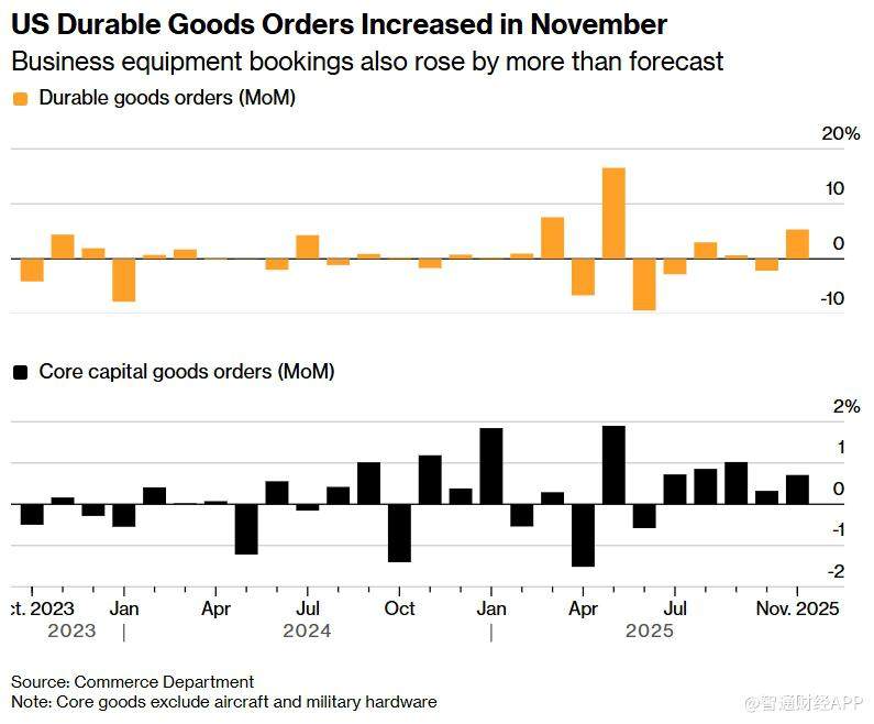 美国耐用品订单在11月录得六个月以来最大涨幅,主要受到商用飞机及其他资本设备预订大幅增加的推动,显示 企业投资动能在进入2026年前持续增强。 美国商务部周一公布的数据显示,11月耐用品订单环比增长5.3%,此前10月数据经修正后为下降2.1%。该报告原 定更早发布,但因联邦政府停摆而延迟公布。耐用品指使用寿命至少三年的商品,包括机械设备、车辆及电子产 品等。 不过,包含飞机在内的非国防资本品出货量下降2%。政府在GDP核算中更侧重出货数据而非订单,因为订单可 能被取消,而出货更能直接反映设备投资对经济增长的贡献。 在耐用品报告发布前,亚特兰大联储GDPNow模型预计第四季度企业设备支出可能略有下降。数据显示,设备投 资在第三季度为GDP贡献了0.28个百分点。 数据同时显示,剔除飞机与军用硬件后的核心资本品订单(被视为企业设备投资的重要指标)在11月增长0.7%,高 于市场预期,反映企业在设备采购方面的需求依然稳健。 报告指出,商用飞机订单波动较大,但11月预订量几乎增长98%。波音公司表示,其11月共获得164架飞机订 单,显著高于10月的15架,并在上月进一步升至175架。 在出货方面,剔除飞机与军用产 ...