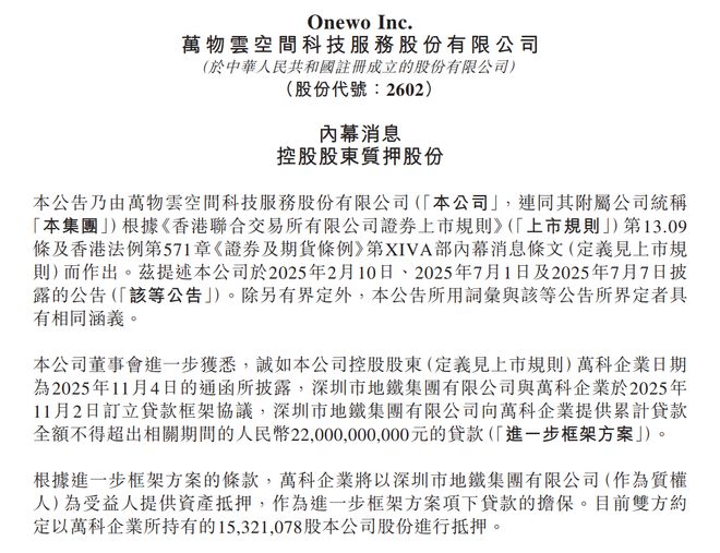 核心事件概述 - 万科将其持有的万物云全部57.16%股权质押给第一大股东深铁集团,作为220亿元贷款框架方案的担保[1][4][5] - 此次质押是自2025年2月以来的第四次质押,累计覆盖万科持有的万物云全部股权[4][5] - 该事件叠加万科近期股债价格下挫、核心子公司股权被冻结等消息,引发市场对其流动性压力的广泛关注[3][6] 深铁纾困协议细节 - 深铁集团向万科提供不超过220亿元的股东借款额度,资金专项用于偿还公司公开市场债券本息及指定借款利息[4] - 协议要求万科以合法经营性房地产、固定资产、存货、在建工程及各类股权作为担保物,其中经营性房地产、股票等资产的抵/质押率设定为60%-70%,非上市公司股权质押率为50%-60%[4] - 若万科未能按要求提供对应担保,深铁集团有权要求其立即偿还已发生的借款本息[4] - 四次质押万物云股权的具体细节为:2月10日质押18.29%股权对应28亿元借款,5月21日质押27.4%股权对应42亿元借款,7月7日质押10.11%股权对应15.51亿元借款,11月28日质押1.33%股权作为220亿元贷款框架担保[4][5] 万科近期财务与市场表现 - 2025年前三季度,公司实现营业收入1613.9亿元,归属于上市公司股东的净亏损为280.2亿元[7] - 截至报告期末,公司持有的货币资金为656.8亿元,有息负债合计3629.3亿元,资产负债率为73.5%[7] - 12月1日,多只万科债券因跌幅达30%被深交所临时停牌,其中"21万科04"跌幅超45%,"21万科06"跌超39%[6][7] - 万科A股当日收于5.2元/股,单日跌幅3.35%[6] - 公司近期动作包括全部出售所持贝壳股票,以及拟将20亿元"22万科MTN004"债券展期,此为万科首次寻求债券兑付展期[6] 万物云经营状况与关联影响 - 2025年上半年,万物云实现营业收入181.38亿元,同比增长3.1%,核心净利润13.21亿元,同比增幅达10.8%[8] - 其循环型业务收入占比升至89.9%,董事会提出了11亿元的中期股息分配方案[8] - 自2024年以来,万物云通过收购万科旗下资产包,抵偿了超20亿元的关联方应收账款[8] - 市场担忧万物云股权全质押可能限制其资本运作空间,若万科无力偿还贷款,深铁作为质权人有权处置股权,或将导致万物云股权结构生变[3][8]