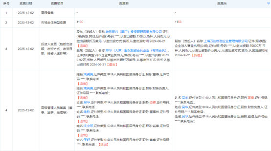 在抛售多座万达广场之后,万达集团似乎有了"新动作"。 天眼查工商信息显示,烟台芝罘万达广场有限公司近日发生工商变更,新华保险(601336)旗下坤华 (天津)股权投资合伙企业(有限合伙)、坤元辰兴(厦门)投资管理咨询有限公司退出股东行列,新增万达商 管旗下上海万达锐驰企业管理有限公司为全资控股股东,同时多位高管发生变更。 | | | | | Carl Concerner Comments of | | --- | --- | --- | --- | --- | | | | | | 码 **** 默买电话:【新进】 | | | | | | 给名 周年,延伸换型 中华人民共和国际最长的证 积条 经理,证件导弹: | | | | | | ** | | | | | 给名 周年 任伴奏堂 中华人民共和国周民廉的征 服务 共行董事美总 | 给名 亚小可 亚体微型中华人民共和国际网易份证 服务 监事 正体号 | | | | 是以管理人民备案 (首 | 经理 证件号码 **** 联系电话: | 码 **** 联系电话:【新进】 | | 8 | 2024-07-01 | 事,应事,经理等) | 体名 清潔屋 在体操型 中华人民 ...