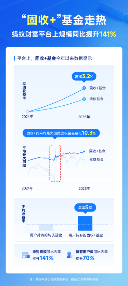 一边是存款利率走低,一边是股市走热。"冰火两重天"之下,投资者开始逐步从单一资产转向多元 配置,以提升收益并降低波动。今年以来,"固收+"基金刚好契合当下市场需求,通过债券底仓获取稳 健收益,少量配置权益资产增厚回报,逐步成为投资者做稳健配置的热门选择。 不过,行业人士也提醒,对于风险偏好较低的投资者,可以优选含权仓位较低的低波"固收+",持 有胜率更高;而能够容忍更高波动的投资者,可以选择中高波"固收+"。中长期来看,在流动性宽松和 低利率的市场环境下,股市整体的上涨趋势仍在,"固收+"产品兼顾股债配置,有"攻守兼备"的投资效 果。 蚂蚁财富平台近日公布的数据显示,截至10月15日,平台上偏债混合"固收+"基金今年以来申购规 模同比去年提升141%,持有用户数同比去年提升了70%。 受益于股市上涨,今年以来行业内"固收+"基金表现亮眼。Wind数据显示,市场约3700只"固收 +"基金中,三季度超过3300只取得了正收益,中位数收益3.54%。部分绩优"固收+"基金今年以来回报 超5%,过去一年回报超10%。 行业人士分析指出,"固收+"基金相当于一个理财汉堡,底层80%以上是国债、金融债等低风险固 收资产 ...