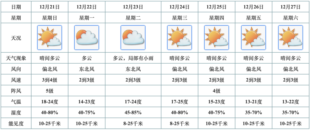 转自:江门发布 无负今日 邑马当先 2025江门马拉松赛 将于今天(12月21日)上午7:30 在五邑华侨广场鸣枪起跑 赛事进行前 这份温馨提示跑友一定要看! ↓↓↓ 关注天气 ▲21日12-18时,晴间多云,19到23℃,偏北风2到3级阵风4级,湿度40%到60%。 健康奔跑 据@江门天气,昨天(20日)夜间开始弱冷空气南下影响,今天(21日)白天晴间多云,北风清劲。 ▲21日06-12时,晴间多云,18到21℃,偏北风3到4级阵风5级,湿度60%到80%; | 日期 | 12月21日 | 12月22日 | 12月23日 | 12月24日 | 12月25日 | 12月26日 | 12月27日 | | --- | --- | --- | --- | --- | --- | --- | --- | | 星期 | 星期日 | 星期一 | 星期二 | 星期三 | 星期四 | 星期五 | 星期六 | | 天况 | | | | | | | | | 天气现象 | 晴间多云 | 多云 | 多云,局部有小雨 | 晴间多云 | 晴间多云 | 晴间多云 | 晴间多云 | | 风向 | 偏北风 | 东北风 | 东北风 | 偏北风 ...