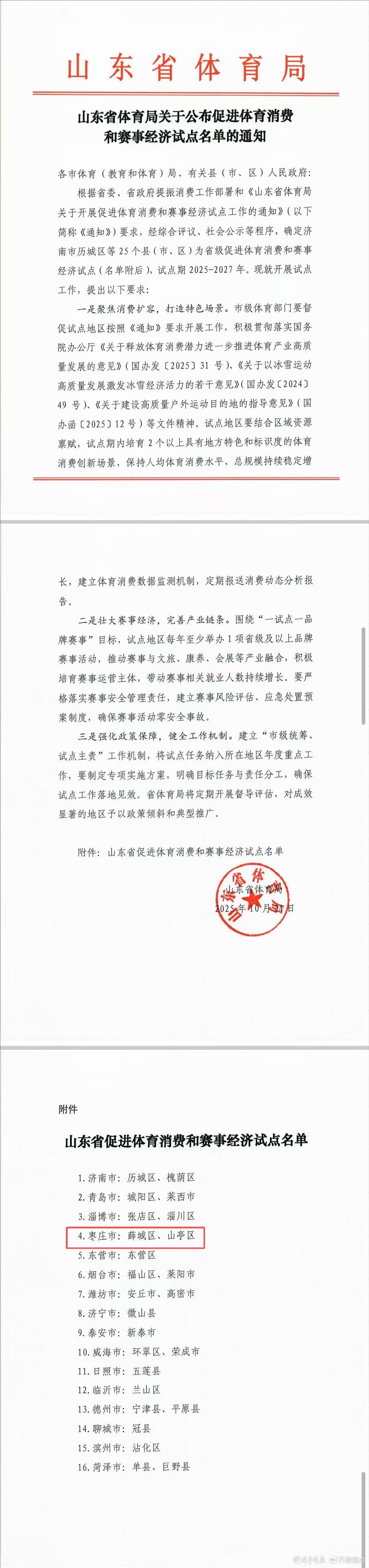 山亭区成功获评山东省促进体育消费和赛事经济试点称号!