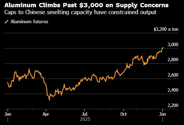 供应担忧致铝价自 2022 年以来首次站上 3000 美元关口