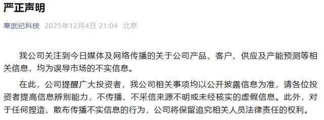 北京商报讯(记者 马换换 王蔓蕾)12月4日晚间,寒武纪(688256)通过微信公众号"寒武纪科技"发布 严正声明表示,公司关注到当日媒体及网络传播的关于公司产品、客户、供应及产能预测等相关信息, 均为误导市场的不实信息。 交易行情显示,截至12月4日收盘,寒武纪股价收涨2.75%,收于1369元/股,总市值5773亿元。 据了解,12月4日,市场出现关于寒武纪计划于2026年提升AI芯片产量等相关传言。 寒武纪提醒广大投资者,公司相关事项均以公开披露信息为准,请各位投资者提高信息辨别能力,不传 播、不采信来源不明或未经核实的虚假信息。此外,对于任何捏造、散布传播不实信息的行为,公司将 保留追究相关人员法律责任的权利。 ...