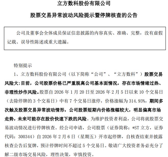 *ST立方:公司股票1月20日至2月5日涨幅314.93% 明起停牌核查