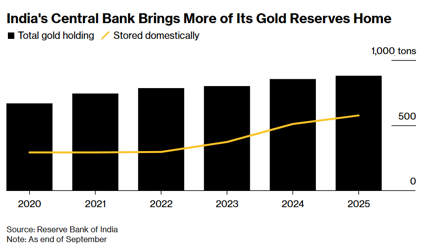 黄金储备国内化趋势 - 印度央行正加速将海外黄金储备运回国内 国内存放的黄金储备占比已超过65% 较四年前几乎翻倍 [1] - 本财年前六个月(自4月起)已运回近64吨黄金 过去四年间累计运回近280吨黄金 [1] - 截至9月底 印度央行持有880吨黄金 其中576吨存放在国内 创历史新高 而在2022年9月 国内存放黄金仅占总量的约38% [1] 外汇储备构成变化 - 截至9月底 按价值计算 黄金占外汇储备总值的13.92% 高于3月底的11.70% [1] - 印度央行是全球黄金的主要买家之一 旨在减少对美元及相关资产的依赖 并已稳步削减美国国债持有量 [2] 市场背景与动机 - 经济学家认为此举可能旨在加强对本国黄金资产的掌控 印度财政部长表示央行正"非常慎重地决策"储备多元化问题 [1] - 央行加速运回黄金的原因包括有能力存储以及在地缘政治不确定时期将黄金掌握在自己手中的合理性 [2] - 近期现货黄金价格屡创历史新高 今年以来现货黄金涨超50% 现报4026.7美元/盎司 [2]