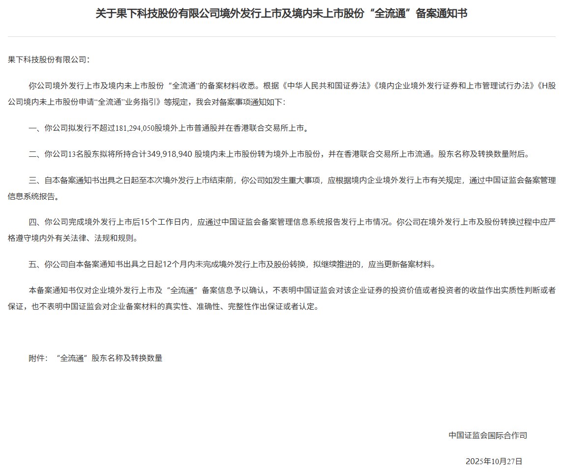 智通财经APP获悉,10月27日,中国证监会国际合作司发布《关于果下科技股份有限公司境外发行上市及境内未上市股份"全流通"备案通知书》。公司拟发 行不超过181,294,050股境外上市普通股并在香港联合交易所上市。公司13名股东拟将所持合计349,918,940 股境内未上市股份转为境外上市股份,并在香港 联合交易所上市流通。 据此前招股书,果下科技专注于研发并向客户及/或终端用户提供储能系统解决方案及产品。储能系统解决方案和产品服务于并能够覆盖电力侧、大电网 侧、工商业及住宅等多种应用场景,适用于中国市场及海外市场。 根据灼识咨询,按2024年全球多用途储能系统新装机容量计,该公司是第八大多用途储能系统中国提供商;按2024年全球户用储能系统出货容量计,是第十 大户用储能系统中国供应商。 附件:"全流通"股东名称及转换数量 | 序号 | 股东名称 | 申请全流通股数(股) | | --- | --- | --- | | 1 | 海南虚鼎信息管理咨询有限公司 | 117,504,000 | | 2 陈俊德 | | 62,271,000 | | 3 | 无锡栾华管理咨询合伙企业(有限合伙) | 56,954, ...