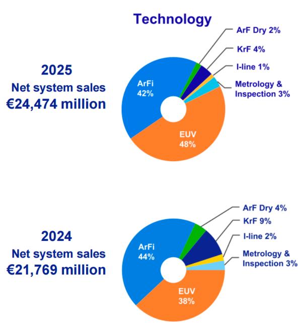行业趋势与周期转变 - 半导体行业正从由手机、PC等单一终端主导的传统周期,转入以“AI算力基建”为代表的多元驱动演进 [1] - 生成式AI进入应用爆发期,全球数据中心对逻辑芯片与HBM的算力需求狂热,拉动先进制程投资回暖,同时AI应用也带动了对成熟制程的需求 [1] ASML 2025年财务表现 - 2025年ASML实现全年净销售额约327亿欧元,全年毛利率约52.8%,净利润约96亿欧元,营收、利润、在手订单全部刷新纪录 [2][4] - 截至2025年末,ASML在手订单规模达到约388亿欧元,为2026年及之后的营收提供了较高可见度 [4] - 公司宣布了一项高达120亿欧元的股票回购计划(执行至2028年底) [19] 产品结构:EUV与DUV双轨驱动 - EUV(极紫外光刻)系统销售额在2025年达到116亿欧元,同比增长39%,在系统收入中的占比从2024年的38%上升至48%,成为占比最高的单一技术类别 [4] - 截至2025年末,公司未交付的388亿欧元订单中有255亿欧元为EUV订单,2025年第四季度确认了两套High-NA EUV系统收入 [4] - DUV(深紫外光刻)系统仍是当前半导体制造体系中不可或缺的核心设备,承担着绝大多数光刻任务 [7] - 高端DUV系统持续进化,例如ArF浸润式光刻机NXT:2150i在量产环境下已实现每小时300片以上晶圆的稳定吞吐能力 [7] - DUV的应用边界正从“前道晶圆制造”向“先进封装与3D集成”延伸,ASML已出货面向3D应用和先进封装领域的首台i-line光刻机XT:260 [8] - ASML的增长逻辑形成了“先进制程由EUV牵引、成熟制程与先进封装由DUV支撑”的双轨结构 [8] 中国市场表现与驱动因素 - 2025年ASML在中国市场的全年净系统销售额占比为33%,高于此前预期,显示出极强的韧性和需求 [9] - 成熟制程(28nm及以上)的大规模扩产是核心动力之一,汽车电子、工业自动化、物联网和家电芯片的需求支撑了对DUV设备(尤其是浸润式ArFi)的确定性需求 [10] - AI需求的“溢出效应”带动了对成熟制程芯片的需求,例如HBM的逻辑基础层与先进封装、AI服务器的电源管理与接口芯片,以及端侧AI应用拉动的传感器、模拟器件等,这些大多由DUV完成 [11] - 先进封装(2.5D/3D)产线建设加快,ASML的相关设备(如XT:260)与中国市场策略高度匹配 [12] - ASML预计2026年中国区的收入占比将稳定在20%左右,这是全球产能配置下的“常态化回归” [12] 公司战略转型:从设备商到平台公司 - ASML正在完成从“周期性设备商”向“结构性平台公司”的转变,围绕光刻环节提供全方位解决方案 [14] - “软硬一体”的工程体系深化:持续强化计算光刻软件、量测与检测业务,2025年量测与检测系统销售额同比增长28%,达到8.25亿欧元,并战略投资13亿欧元于Mistral AI以利用AI强化核心竞争力 [15] - “存量复利”带来现金流重塑:2025年装机售后服务营收约82亿欧元,同比增长超25%,已成为继系统销售后的第二大收入来源,构建起接近百亿欧元规模的“年费型业务池” [15] - 公司正从“卖硬件的设备公司”向“系统级算力制造基础设施的平台公司”转型 [19] 未来业绩展望 - ASML预计2026年净销售额将在340亿至390亿欧元区间,毛利率维持在51%–53%,其中第一季度净销售额预计为82亿至89亿欧元,装机售后服务单季净销售额约24亿欧元 [18] - 公司维持长期指引不变:到2030年,总营收有望达到440亿至600亿欧元,毛利率提升至56%–60% [18] - AI作为最核心的需求源头,是未来增长的重要驱动力,行业对AI相关数据中心与基础设施建设的预期改善,正转化为对先进制程产能的实际需求,并直接带动对EUV的需求增长 [18]