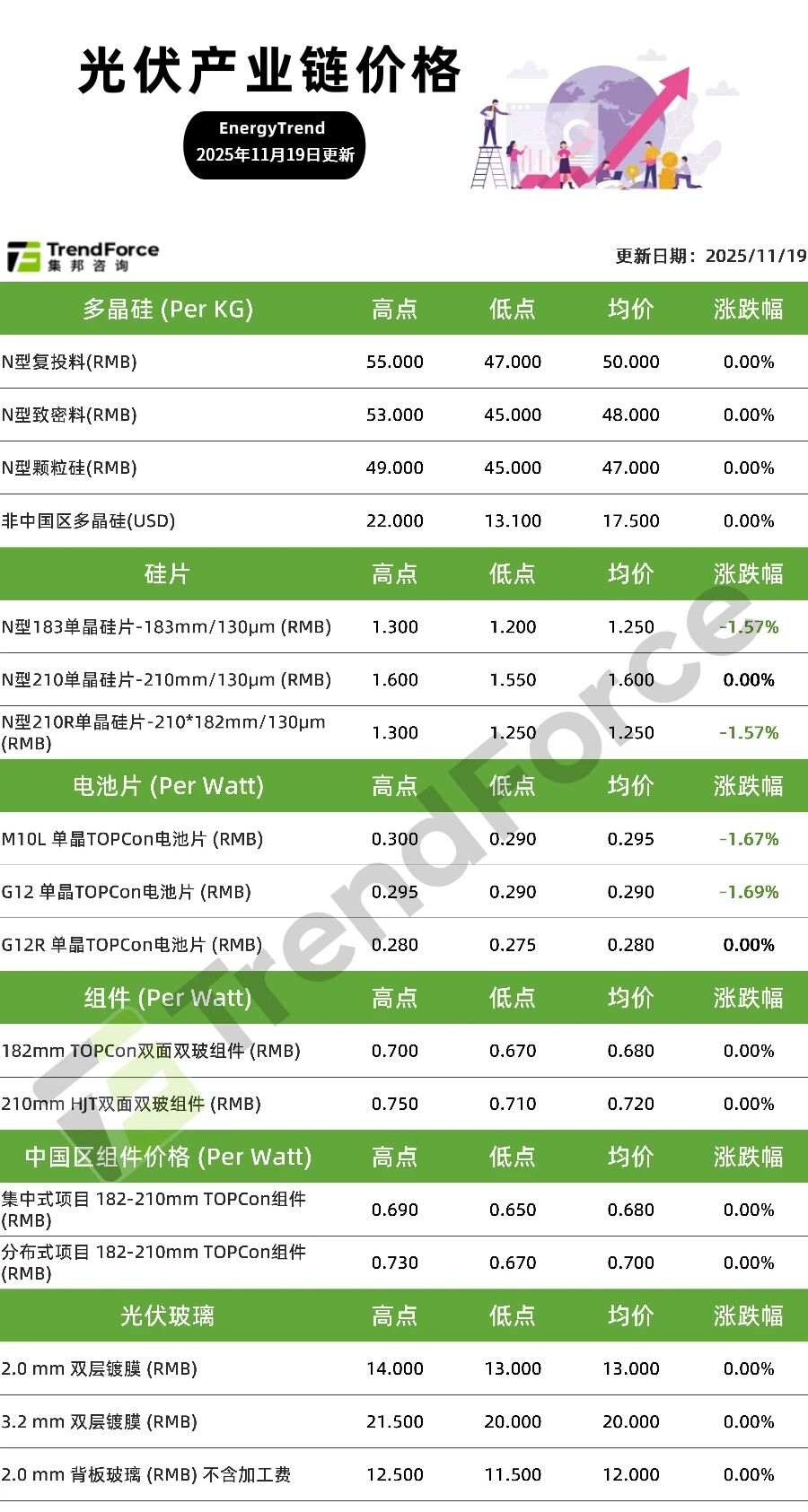 多晶硅环节 - 多晶硅价格呈现弱稳态势,高库存和低需求冲击下,因供应端收缩及产业链反内卷共识,价格获短期支撑未大幅下跌 [1] - 供应端出现实质性收缩,龙头部分基地停产,减产动作对冲需求走弱负面影响,市场供应压力缓解 [2] - 需求端持续疲软,下游价格普跌,硅片企业逐步减产导致拉晶厂采购意愿极低,行业库存维持在43万吨以上高位压制市场信心 [2] 硅片环节 - 硅片价格重心下移,行业总库存维持在23GW以上高位,厂商出货阻力大,市场策略分化,一线企业挺价而二三线企业低价出货 [3] - 需求端持续走弱,210N产品需求明显减弱,市场成交氛围冷清订单不足,实际成交量甚少 [3] - 183N及210R低价触及1.25元,210N低价跌至1.55元,后续价格下降空间取决于上游硅料成本松动及下游电池片价格下行幅度 [3] 电池片环节 - 电池片供给端出货压力普遍增大,库存维持在7天左右,210N电池因订单流失库存周转面临挑战 [4] - 需求端呈现内外双降,印度等海外市场采买需求骤减致183N电池疲软,国内北方集中式项目建设减弱致210N电池需求骤降 [4] - 183N与210N电池价格回落至0.29元/W,210RN电池维持在0.28元/W低位,后市在需求未见好转下仍面临下行风险 [4] 光伏组件环节 - 供给端策略分化,主流厂商为完成年度目标冲量意愿强积极出货,部分小型生产商传出休假停工消息,组件厂面临减产调整 [5] - 需求端受季节性因素持续萎缩,冬季国内外整体需求下降,国内大版型组件需求减弱,12月终端需求有进一步走弱迹象 [5] - 组件厂商释放议价空间,价格重心滑落至0.65-0.68元/W,低价部分触及0.65元/W,后市将采取减产挺价策略价格维持弱势运行 [5] 产品价格数据 - N型致密料价格区间为45,000-53,000元/吨,均价48,000元/吨,N型颗粒硅价格区间为45,000-49,000元/吨,均价47,000元/吨 [7] - N型183单晶硅片均价1.250元/片下跌1.57%,N型210单晶硅片均价1.600元/片,N型210R单晶硅片均价1.250元/片下跌1.57% [7] - M10L单晶TOPCon电池片均价0.295元/W下跌1.67%,G12单晶TOPCon电池片均价0.290元/W下跌1.69%,G12R单晶TOPCon电池片均价0.280元/W [7] - 182mm TOPCon双面双玻组件均价0.680元/W,210mm HJT双面双玻组件均价0.720元/W,集中式项目TOPCon组件均价0.680元/W [7] - 光伏玻璃2.0mm双层镀膜均价13.000元/平方米,3.2mm双层镀膜均价20.000元/平方米,2.0mm背板玻璃均价12.000元/平方米 [7]