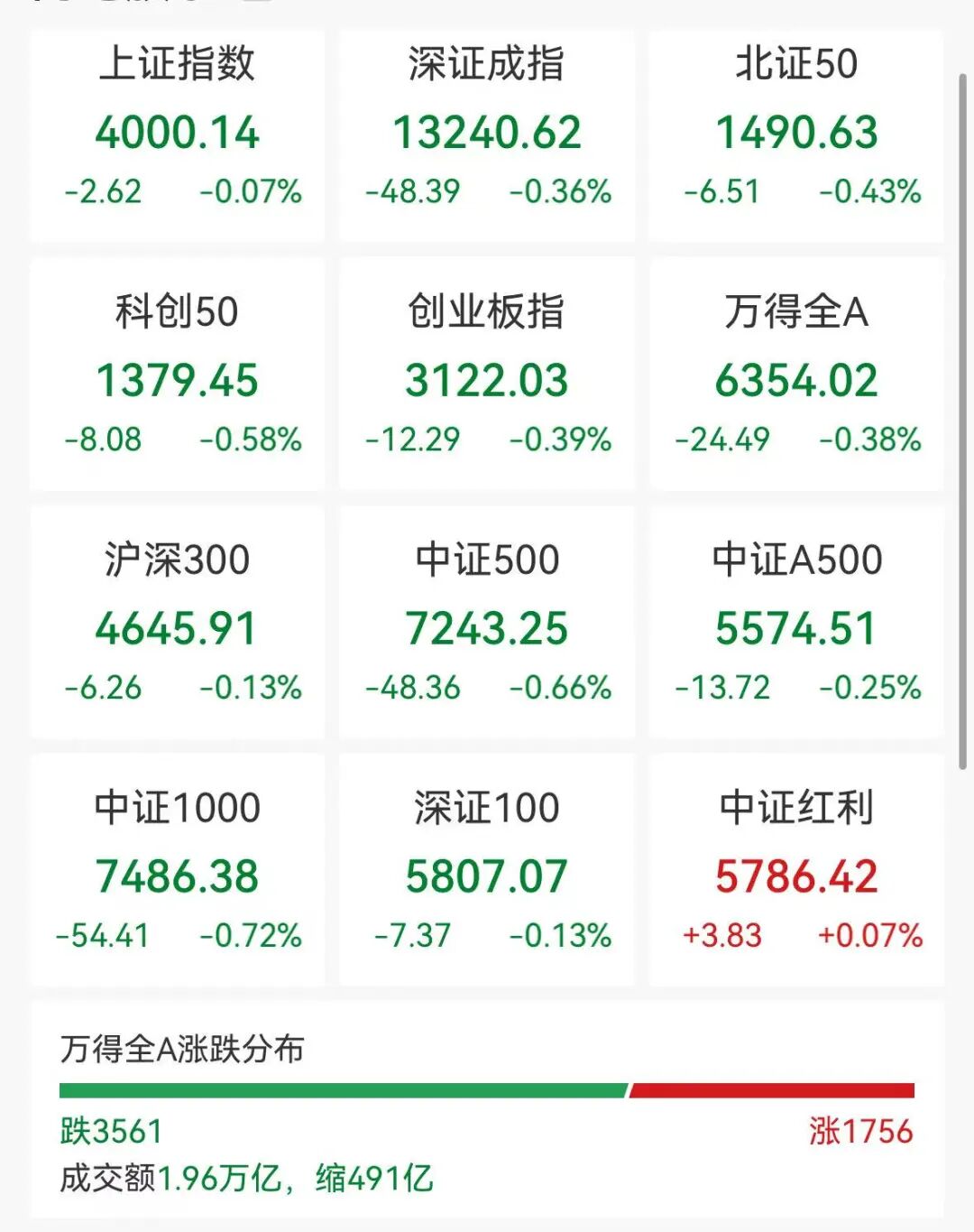 市场整体表现 - A股市场探底回升,沪指微跌0.07%,深成指跌0.36%,创业板指跌0.39% [1] - 沪深两市成交额1.96万亿元,较上一个交易日缩量491亿元 [1][2] - 万得全A涨跌分布显示3561只股票下跌,1756只股票上涨 [2] 板块表现 - 防御性板块集体走强,油气概念爆发,石化油服、准油股份双双涨停 [2] - 银行板块表现强势,农业银行、工商银行双双创历史新高 [2] - 保险、医药、油气等板块涨幅居前 [2] - 培育钻石、光伏、可控核聚变等板块跌幅居前 [2] 光伏板块 - 光伏板块大跳水,光伏指数下跌2.73%至3781.17点 [4][5] - 阿特斯跌超14%,艾罗能源跌10.16%,亿晶光电跌7.81%,多股跌超7% [4][5][6] - 下跌源于网络传播的"光伏产能收储平台黄了"的不实消息,此前"光伏产能收储17家企业基本都已签字"的消息曾引爆板块 [6] - 中国光伏行业协会发文称网络流传的小道消息均为不实信息 [7] - 开源证券表示当前光伏行业反内卷已取得一定积极成效,三季度主链上游环节预计显著减亏 [7] 创新药板块 - 创新药概念持续活跃,众生药业涨停,济民健康、南京新百、中源协和、盘龙药业此前封板 [9] - 三元基因、冠昊生物、热景生物等跟涨 [9] - 光大证券表示头部创新药公司产品销售持续放量叠加部分公司收到BD交易首付款带动业绩增长 [9] 个股异动 - 合富中国在最近12个交易日内共斩获11个涨停板,股价涨幅超过200% [11] - 公司已发布9道风险提示,证券部工作人员表示没有应披露而未披露的重大消息 [13] - 港股巨星传奇午后股价直线拉升,盘中一度涨超20% [15] - 上涨源于公司与机器人公司宇树科技成立合资企业,共同开发消费级IP机器人 [17]