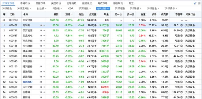 光伏板块突然大跌! 截至11月12日收盘,光伏设备(BK1031)跌幅为3.31%,隆基绿能(601012.SH)、亿晶光电 (600537.SH)、双良节能(600481.SH)等多只个股跌幅超7%,阿特斯(688472.SH)盘中跌幅一度超 过17%。 | 炉紧急市场 | | 香港市场 | 美国市场 | 英国市场 | 金球招配 | | 股转系统 | 開权市场 | 期货现货 | 外汇 | | | | | 可用 | | --- | --- | --- | --- | --- | --- | --- | --- | --- | --- | --- | --- | --- | --- | --- | --- | | 品温暖合 | | 沪深京A服 ▼ | 制带能。 | 料创板 ~ | CDR | 沪深指数 ~ | | 光伏设备 ~ | P温灌通 | PHOBB A | | 护深基金 P | 沪深德舞 ▼ | | | | 序 | 代码 | 名称 | | 最新 | 液幅 ~ | 涨跌 | 成交量 | 现量 | 英一份 | 要一份 | 落速 | 损失 | 成交额 | 市盈率 | 所属行业 | | 0 | BK1031 | ...