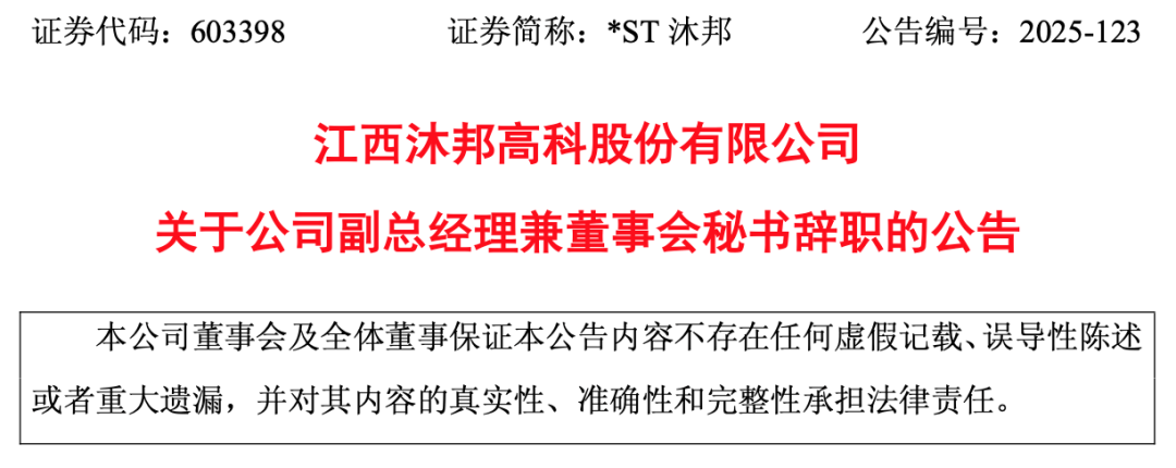 10月25日,*ST沐邦发布关于公司副总经理兼董事会秘书辞职的公告。 公告显示,公司董事会于近日收到公司副总经理兼董事会秘书刘毅先生的书面辞职报告。因工作调整,刘毅先生书面申请辞去公司副总经理职务以及董事 会秘书职务,辞去上述职务后,刘毅先生仍将在公司担任其他职务。 根据《公司法》《上海证券交易所股票上市规则》《公司章程》等相关规定,刘毅先生的辞职申请自送达董事会之日起生效。为保证董事会工作的正常进 行,公司在聘任新的董事会秘书之前,暂由公司董事廖志鹏先生代行董事会秘书职责,同时公司董事会将按照相关规定尽快完成董事会秘书的选聘工作。 刘毅先生已按照公司相关规定完成董事会秘书事务的交接工作,其辞去上述 职务不会对公司生产经营业务、重大事项决策、内部控制有效性等产生不利 影响。 公司及董事会对刘毅先生任职期间为公司所做出的贡献表示衷心的感谢! 廖志鹏先生简历 廖志鹏先生,1998 年生,中国国籍,无境外永久居留权,2022 年 3 月至 2023 年 12 月任广东美奇林互动科技有限公司执行董事、总经理,2021 年 11 月 至今任江西沐邦高科股份有限公司董事长助理,2021 年 12 月至今任江西邦宝教育科技 ...