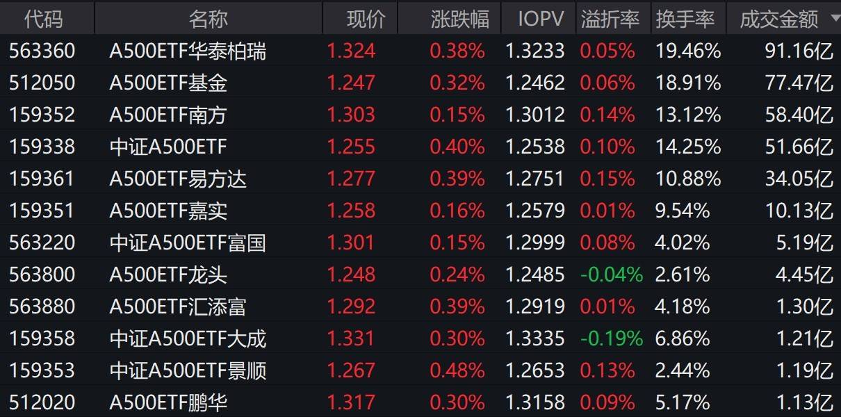 | 代码 | 名称 | 现价 | 涨跌幅 | IOPV 微干燥 附点膜 成 | | --- | --- | --- | --- | --- | | 563360 | A500ETF华泰柏瑞 | 1.324 | 0.38% | 1.3233 0.05% 19.46% | | 512050 | A500ETF基金 | 1.247 | 0.32% | 1.2462 0.06% 18.91% | | 159352 | A500ETF南方 | 1.303 | 0.15% | 1.3012 0.14% 13.12% | | 159338 | 中证A500ETF | 1.255 | 0.40% | 1.2538 0.10% 14.25% | | 159361 | A500ETF易方达 | 1.277 | 0.39% | 1.2751 0.15% 10.88% | | 159351 | A500ETF嘉实 | 1.258 | 0.16% | 1.2579 0.01% 9.54% | | 563220 | 中证A500ETF富国 | 1.301 | 0.15% | 1.2999 0.08% 4.02% | | 563800 | ...