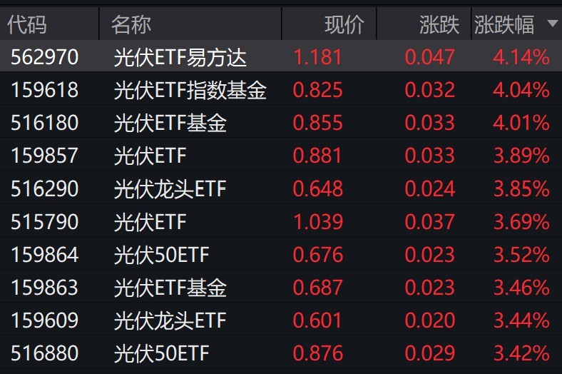 有机构表示,当前光伏行业"反内卷"已取得一定积极成效,三季度主链上游环节预计显著减亏,后续关注底部 反转;储能行业呈现供需两旺态势,国内外需求共振,新型储能"一芯难求",头部电池企业持续满产,电池价 格延续上涨趋势,供应链整体具备价格传导能力,储能景气度有望持续。 (文章来源:每日经济新闻) 受盘面影响,光伏相关ETF涨约4%。 | 代码 | 名称 | 现价 | 涨跌 | 涨跌幅 ▼ | | --- | --- | --- | --- | --- | | 562970 | 光伏ETF易方达 | 1.181 | 0.047 | 4.14% | | 159618 | 光伏ETF指数基金 | 0.825 | 0.032 | 4.04% | | 516180 | 光伏ETF基金 | 0.855 | 0.033 | 4.01% | | 159857 | 光伏ETF | 0.881 | 0.033 | 3.89% | | 516290 | 光伏龙头ETF | 0.648 | 0.024 | 3.85% | | 515790 | 光伏ETF | 1.039 | 0.037 | 3.69% | | 159864 | 光伏50 ...