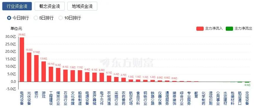 净流出方面,电池、半导体、小金属等净流出排名靠前,其中电池净流出50.14亿元。 A股三大指数今日集体小幅收涨,沪指涨0.55%,收报3976.52点;深证成指涨0.19%,收报13404.06点;创业板指涨0.29%, 收报3196.87点。沪深两市成交额达到21071亿,较上一交易日缩量2107亿。 行业板块多数收涨,船舶制造、游戏、文化传媒、煤炭行业、光伏设备、电源设备、石油行业、采掘行业、航空机场板块涨 幅居前,小金属、电池、珠宝首饰板块跌幅居前。 个股方面,上涨股票数量超过3500只,近百股涨停。熔盐储能概念股大涨,迪尔化工涨超20%,东华科技涨停。AI应用端反 复活跃,吉视传媒、三七互娱等涨停。煤炭板块再度走强,安泰集团13天7板。海南自贸区板块延续强势,罗牛山等多股涨 停。存储芯片概念股回暖,普冉股份涨超14%。光伏概念股表现活跃,阿特斯涨超12%。 行业资金方面,截至收盘,电网设备、光伏设备、银行等净流入排名靠前,其中电网设备净流入29.62亿。 来源市场信息 (文章来源:国际金融报) ...