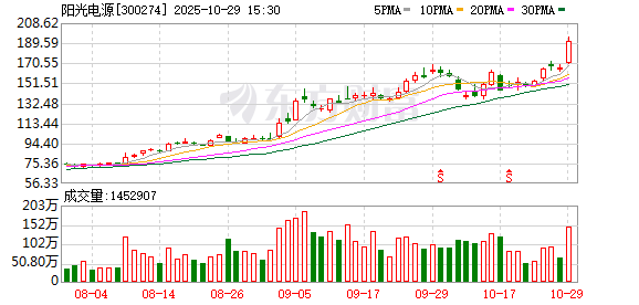 10月29日,光伏储能龙头企业阳光电源(300274.SZ)股价持续走高,盘中涨幅一度达17.54%至194.97 元/股,续创历史新高,总市值一度突破4000亿元大关。 截至收盘,阳光电源报收191.49元/股,日内涨幅15.44%,市值维持在3970亿元,稳坐A股光储板块市 值"一哥"位置。盘后龙虎榜数据显示,4家机构专用席位净买入10.55亿元。 此次股价大涨背后,是公司亮眼的三季度业绩成绩单。据阳光电源10月28日晚间发布的2025年三季报显 示,公司第三季度实现营业收入228.69亿元,同比增长20.83%;归母净利润达41.47亿元,同比增长 57.04%,创下公司上市以来的单季净利润新高。 从累计数据看,2025年前三季度公司营收达664.02亿元,同比增长32.95%;净利润118.81亿元,同比增 长56.34%,这一净利润规模已超过2024年全年水平。 对此,21财经·南财快讯记者以投资者身份致电阳光电源,接线工作人员表示,公司业绩的大幅增长得 益于业务稳定经营和品牌价值提升,公司正等待赴港上市的监管审核结果。对于二级市场股价变动,因 原因较多,不便分析。 从具体业务来看,阳光电源此轮业绩 ...
