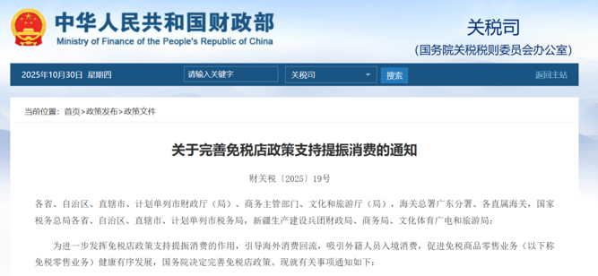 五部门联合发文:11月1日起完善免税店政策,支持提振消费!