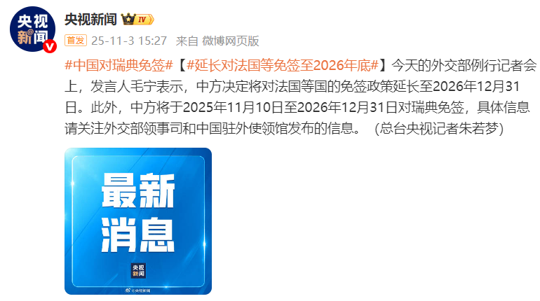 据央视新闻消息:11月3日的外交部例行记者会上,发言人毛宁表示,中方决定将对法国等国的免签政策延长 至2026年12月31日。 此外,中方将于2025年11月10日至2026年12月31日对瑞典免签,具体信息请关注外交部领事司和中国驻外使领 馆发布的信息。 发言人毛宁还介绍:综合考虑中国游客出境需求、当地旅游环境等各方面的情况,中方决定恢复旅行社经营中 国公民赴加拿大团队游业务,相信这将进一步促进中国同加拿大的人员往来,增进两国人民的相互了解和友 谊。 ...
