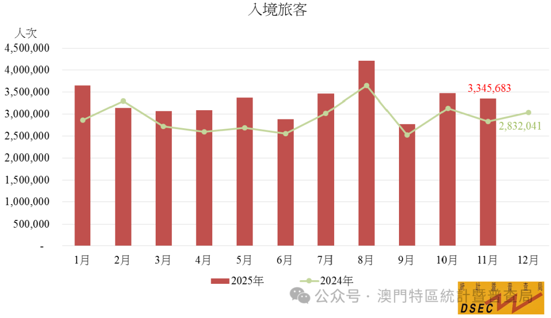 11月国际旅客共273,950人次,按年增加13.6%。东南亚市场方面,菲律宾(49,748人次)、印尼(18,109人次),以及泰国(15,140人次)旅客同比分别上升 2.3%、23.1%,以及49.4%。马来西亚旅客(20,706人次)与去年同期相若,新加坡旅客(12,920人次)则下跌6.6%。来自南亚的印度(8,766人次)旅客较去年同 期增加3.1%。东北亚的韩国(55,517人次)及日本(16,187人次)旅客按年分别增加14.2%及38.1%。长途客源中,美国旅客(17,502人次)按年上升7.9%。 按入境渠道统计,11月经陆路(2,753,786人次,占总数82.3%)入境的旅客按年上升21.4%,其中经关闸和横琴口岸入境的旅客分别录得30.4%及57.0%增幅。 经海路(328,691人次,占9.8%)及经空路(263,206人次,占7.9%)入境的旅客同比分别上升5.1%及4.9%。 2025年首十一个月的入境旅客共36,489,230人次,按年上升14.4%;不过夜旅客(21,417,604人次)及留宿旅客(15,071,626人次)分别增加24.7%及2.4%。旅客 累计平均逗留时 ...
