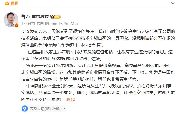 "零跑称与华为道不同不相为谋"一说近日引发外界关注,而该事件在今天迎来"反转"。 10月30日下午,零跑汽车高级副总裁曹力在社交媒体表示,D19发布以来,零跑受到了很多的关 注。"我在当时的交流会中与大家分享了公司的技术战略,表明公司会坚持核心技术全域自研的一贯理 念。没想到被部分不在场的媒体曲解为'零跑称与华为道不同不相为谋'。" 《中国经营报》记者注意到,曹力也对此进行了"辟谣":"在这里和大家正式声明:我从来没说过这句 话,也没有表达过类似的意思。这个事实在场的近60家媒体可以监督、佐证。" 公开信息显示,在10月17日的媒体专访中,曹力曾表示,该公司在智驾方面经过几年的沉淀和积累,投 入了更多的开发,后续会上自己的高阶智驾。 在"辟谣"外,曹力表示,零跑是一家专注技术创新,专注为用户提供高配置、高质量产品的公司。"我 们走全域自研的路线,这与和其他优秀企业展开合作不矛盾、不冲突。"在曹力看来,"华为是中国科技 自立自强的标杆,是我们学习的榜样,我们也非常尊重华为。" "中国新能源产业走到今天,是所有从业者共同努力的成果。"曹力最后表示,"真心呼吁大家用事实说 话,共同营造一个客观、理性、健康的舆论环境 ...