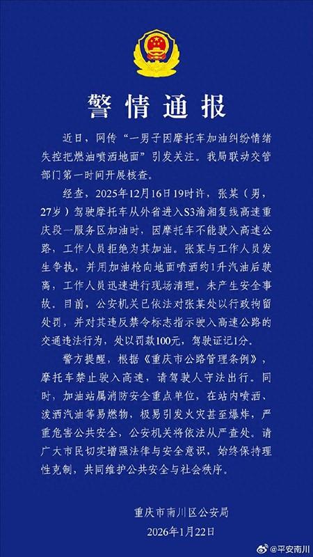 事件概述 - 2025年12月16日19时许,一名27岁男子张某驾驶摩托车在S3渝湘复线高速重庆段一服务区,因摩托车禁止驶入高速而被工作人员拒绝加油,双方发生争执后,张某用加油枪向地面喷洒约1升汽油后驶离[1] - 事件相关视频于2025年1月21日在网络传播引发关注,视频显示男子要求“加5块钱的”油被拒,工作人员要求其向公安局报备,男子最终将汽油喷到地面[4] - 公安机关已依法对张某处以行政拘留,并对其违反禁令标志指示驶入高速公路的交通违法行为,处以罚款100元,驾驶证记1分[1] 涉事公司行为与规定 - 加油站工作人员拒绝为摩托车加油的行为是按照公司规定进行的正常劝阻[6] - 工作人员在事件中明确表示,未报备的情况下为摩托车加油可能导致其“丢工作”[4] - 事发后,工作人员迅速对喷洒在地面约1升的汽油进行了现场清理,未产生安全事故[1][6] 相关法规与行业背景 - 根据《重庆市公路管理条例》,摩托车禁止驶入高速公路[1] - 加油站属于消防安全重点单位,在站内喷洒、泼洒汽油等易燃物,极易引发火灾甚至爆炸,严重危害公共安全[1] - 重庆高速公路交巡警部门确认,重庆高速禁止摩托车驶入是既定规定[6]
