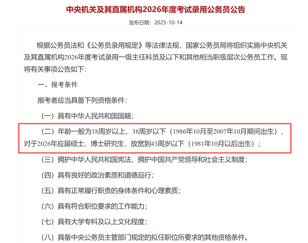 今天(14日),国家公务员局消息,中央机关及其直属机构2026年度考试录用公务员报名即将开始,共计划招录3.81万人。 中央机关及其直属机构2026年度考试录用公务员公告显示,报考者年龄一般为18周岁以上、38周岁以下(1986年10月至2007年10月期间出生),对于2026 年应届硕士、博士研究生,放宽到43周岁以下(1981年10月以后出生)。 每经编辑|段炼 本次考试录用公务员工作主要有4个方面特点: 一是坚持突出政治标准。坚持党管干部原则,落实新时代好干部标准,把政治标准和政治要求贯穿公务员招录全过程各方面。考试环节突出公务员政治属 性,行政职业能力测验科目继续单独设置"政治理论"部分,重点测查用党的创新理论指导分析和解决问题的能力;考察环节全面了解考生的德、能、勤、 绩、廉,重点了解政治素质、道德品行、遵纪守法等方面情况。严格把好新录用人员政治关,对政治上不合格的坚决不予录用。 二是积极服务中心大局。按照实施渐进式延迟法定退休年龄有关政策要求,对公务员招录年龄条件作了适当放宽调整。继续做好招录高校毕业生工作,中 央机关直属的市(地)级及以下机构主要招录应届高校毕业生,设置约2.6万个计划,服务和促 ...