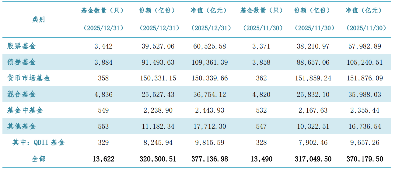 行业规模与结构 - 截至2025年12月底,中国境内公募基金管理机构共计165家,包括150家基金管理公司和15家取得公募资格的资产管理机构 [1] - 以上机构管理的公募基金资产净值合计达到37.71万亿元 [1] 各类基金资产与规模变化 - 全部公募基金总资产净值为377,136.98亿元,基金数量为13,622只,份额为320,300.51亿份 [2] - 股票基金资产净值为60,525.58亿元,份额为39,527.06亿份,基金数量为3,442只,较上月数量增加71只,份额增加1,316.09亿份 [2] - 债券基金资产净值为109,361.39亿元,份额为91,493.63亿份,基金数量为3,884只,较上月数量增加26只,份额增加2,836.57亿份 [2] - 货币市场基金资产净值为150,339.66亿元,份额为150,331.15亿份,基金数量为358只,较上月数量减少4只,份额减少1,528.09亿份 [2] - 混合基金资产净值为36,754.12亿元,份额为25,527.43亿份,基金数量为4,836只,较上月数量增加16只,份额减少304.67亿份 [2] - 基金中基金资产净值为2,443.93亿元,份额为2,238.90亿份,基金数量为549只,较上月数量增加17只,份额增加71.27亿份 [2] - 其他基金资产净值为17,712.30亿元,份额为11,182.34亿份,基金数量为553只,较上月数量增加6只,份额增加859.83亿份 [2] - 在其他基金中,QDII基金资产净值为9,815.59亿元,份额为8,245.94亿份,基金数量为329只,较上月数量增加1只,份额增加343.48亿份 [2]