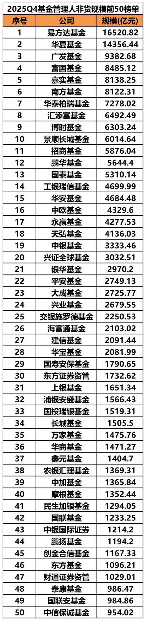 全市场公募基金规模概览 - 截至2025年第四季度末,全市场公募基金管理规模达37.63万亿元,较第三季度末增长1.18万亿元,增幅为3.24% [1][2] - 货币市场基金规模增长5711.93亿元,增幅为3.97% [6] 各类型基金规模变动 - 商品类(其他基金)规模增长1810.91亿元,增幅高达44.89%,增幅位列各类基金首位 [1][7] - 被动股票业务单元规模单季度新增1177.55亿元 [4] - 国内债券业务单元规模增加3303.73亿元,环比增长3.11% [5] - 境外投资基金规模增加907.51亿元,增幅为6.74% [7] - 基金中基金(FOF)规模增幅达26.22% [7] - 国内股债混合业务单元规模减少46.44亿元 [4] 基金管理人非货币基金规模排名 - 易方达基金非货币基金规模为1.65万亿元,位居全市场第一 [1][8][9] - 华夏基金非货币基金规模为1.44万亿元,名列第二 [1][8][9] - 广发基金非货币基金规模为9382.68亿元,位居第三 [1][8][9] - 富国基金、嘉实基金、南方基金、华泰柏瑞基金、汇添富基金、博时基金、景顺长城基金分列第四至第十位 [8][9][10] 非货币基金规模增长领先的基金管理人 - 景顺长城基金非货规模增长465.93亿元,环比增幅8.40%,位居增长榜首 [11][12] - 招商基金非货规模增长400.37亿元,环比增幅7.31%,位居第二 [11][12] - 国泰基金非货规模增长396.26亿元,环比增幅8.06%,名列第三 [11][12] - 建信基金非货规模增长289.01亿元,环比增幅16.03%,增幅显著 [12] - 平安基金非货规模增长251.54亿元,环比增幅10.07% [12] 基金管理人权益类基金(含QDII)规模排名 - 易方达基金权益类基金规模为10807.52亿元,位居第一 [13][14] - 华夏基金权益类基金规模为10189.54亿元,位居第二 [13][14] - 华泰柏瑞基金权益类基金规模为6345.33亿元,位居第三 [13][14] - 南方基金、嘉实基金、广发基金权益类基金规模均超过4000亿元,分列第四到第六位 [13][14] - 富国基金、汇添富基金、国泰基金、景顺长城基金分列第七到第十位 [13][14] 权益类基金(含QDII)规模增量领先的基金管理人 - 南方基金权益类基金规模增量居首,增加385.57亿元 [15] - 华夏基金权益类基金规模增量紧随其后,增加329.61亿元 [15] - 永赢基金、华泰柏瑞基金权益类基金规模增量分别为259.48亿元、242.37亿元 [15] - 广发、国泰、摩根、天弘等公司权益类基金规模增长也位居市场前列 [15] 基金管理人主动权益类基金(含QDII)规模排名 - 易方达基金主动权益基金规模为2355.53亿元,位列第一 [17][18] - 中欧基金主动权益基金规模为1682.07亿元,位列第二 [17][18] - 广发基金主动权益基金规模为1569.08亿元,位列第三 [17][18] - 富国基金、汇添富基金、景顺长城基金、嘉实基金、永赢基金、华夏基金、工银瑞信基金分列第四至第十位 [17][18] 主动权益类基金规模增量与增幅领先的基金管理人 - 永赢基金主动权益基金规模增长超200亿元,位居增量榜单第一 [19] - 永赢基金主动权益基金规模环比增长22.66%,截至第四季度末规模超1115亿元 [19] - 国金、鹏华、中航、华富、安信、西部利得等公司主动权益基金规模增长也位居市场前列 [19]