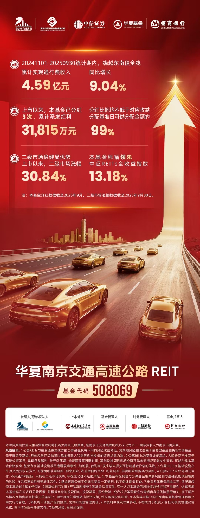 这幅画卷的宏阔背景,是国家"十四五"规划与推动公募REITs健康发展战略的纵深推进。南京交通REIT 的探索与实践,正是这一国家战略的生动地方样本。对南京交通集团与华夏基金而言,公募REITs发行 的一周年,是南京绕越东南段这条现代化高速公路向新而行、与时代同频的崭新开端。 这一年,我们专业运营深度赋能,主动管理提质效,资产价值跃升。 登录新浪财经APP 搜索【信披】查看更多考评等级 如果把南京交通REIT的一周年历程浓缩为一幅画卷,我们会看到什么? 资本市场鸣锣开市,全国首单绕城高速公路REIT"破土而生",为基建投资、民生福祉与公众财富筑起 一座"金桥"。 车流如织,日均4万余辆的通行轨迹与9%的年度收入增长,勾勒出经济动脉的蓬勃生机。 智慧赋能,治堵方案折桂,科技笔触绘就安全畅通新图景; 成果共享,3次收益分配、累计派发31,815万元,如同饱满的秋实,落笔在投资者满意的笑容里…… 分派能力扎实,真金白银显价值:上市以来,截至2025年9月,本基金已实施3次收益分配,累计派发红 利31,815万元,分红比例均不低于对应收益分配基准日可供分配金额的99%。以"真金白银"切实回报 投资者信任,证明了稳健的投 ...