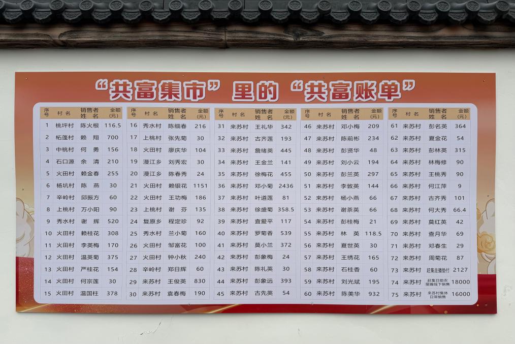 共富集市模式概述 - 江西省九江市修水县山口镇依托每月2日和16日的赶集日,自2024年10月起打造“共富集市”助农直播模式,旨在拓宽农产品销售渠道,带动农民增收致富 [1] - 该模式采用“线下摆摊+线上直播”的销售形式,由村干部在赶集日前一天上门收购并分类整理村民农产品,赶集日当天进行线下售卖与线上直播销售 [3] - 直播作为该模式的核心特色,单场直播销售额已稳定在3000元以上,累计直播销售额达10万元,惠及100余户群众 [5] 运营数据与农民增收 - 一面墙上张贴的“共富账单”统计了72名村民通过“共富集市”在近半年内获得的收入,账单显示个人收入从数十元至数千元不等,例如来苏村村民邓小菊收入2436元,火田村村民赖银花收入1151元,秀水村村民谢辉收入520元 [1][2] - 具体案例显示,来苏村村民黄振秀通过该模式赚取800多元,来苏村村支书彭光明在一次3个多小时的直播中,累计成交接近200单,成交金额突破4400元 [3] - 账单底部数据提及“开箱击量的付 2127”、“赶集日助农 18000”、“来苏村集体 16000”,可能指特定活动或集体的收入金额 [2] 模式推广与未来规划 - 修水县计划统筹培训资源,加强指导帮扶,在全县逐步推广“共富集市”模式,让更多群众受益 [5] - 山口镇将聚焦部分农产品储备不足、附加值低等问题,推动农产品标准化车间项目建设,以提升农产品价值,将“好收成”转化为“好收入” [5] - 该模式被认为结合了当地赶集特色,既锻炼了村干部的能力,凝聚了民心,又成功将山区农产品转化为经济收入 [5]