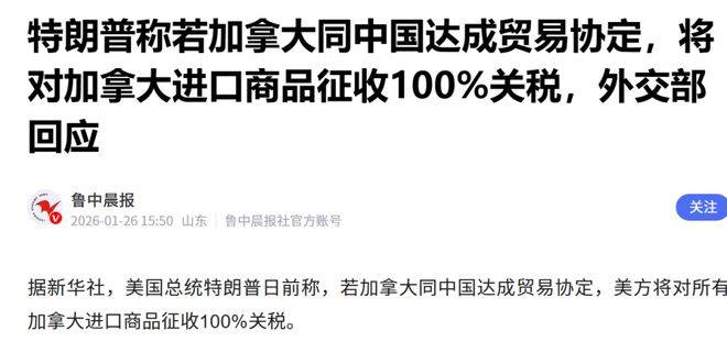 这并不是美国第一次这么干。在格陵兰岛的争议中,美国曾威胁过丹麦、德国等欧洲国家;更早前,为 了制裁伊朗,美国威胁要对所有与伊朗有贸易往来的国家加征25%的惩罚性关税。在华盛顿的眼里,关 税早已不再是调节贸易的经济工具,而是一个用来胁迫他国、实现自己地缘政治目标的大棒。无论是 谁,只要不服从,都会被狠狠打压,哪怕是自己的盟友也不例外。 特朗普这番近乎最后通牒的威胁,把本来亲密的盟友加拿大直接架在了火上。可是,仅仅两天后,在 2026年1月26日,中国外交部发言人郭嘉昆在北京蓝厅的回应中,却展现了别样的理性与清醒:中国主 张各国应以共赢而非零和的理念、合作而非对抗的方式处理国与国之间的关系。没有激烈的指责,也没 有强硬的威胁,就这一句话,仿佛给美国的霸道做了一个鲜明的对比,也说出了很多国家的心声。美国 这波操作,真的是把霸权主义四个字写在了脸上。所谓的关税威胁,实质上就是长臂管辖的升级版—— 你是我的盟友,所以你和谁做生意、发展什么关系都得听我的,否则,我就用关税来收拾你。这种逻辑 不仅无视了加拿大作为一个主权国家的自主选择权,还把盟友这两个字,变成了附属的代名词。 最近,北美的政坛和经贸圈被一则狠通知搅得鸡犬不 ...