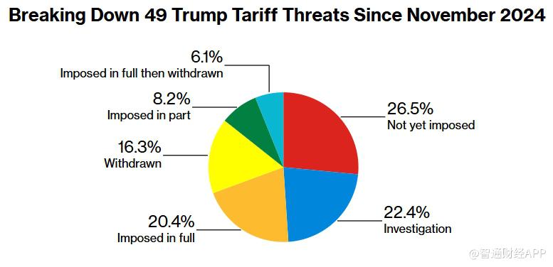 文章核心观点 - 金融市场和企业界对特朗普近期多项关税威胁反应冷淡,普遍将其视为争取谈判筹码的“施压工具”,而非必定执行的政策行动 [1] - 市场人士认为特朗普的关税言论更多体现“谈判策略”,投资者对其威胁的敏感度正在下降 [4] 关税威胁的执行情况 - 研究发现,特朗普最终仅约四分之一的关税威胁会落地实施 [1] - 在其发出的关税威胁中,约43%最终被撤回,有时特朗普会宣称已取得“胜利”,或者至今尚未正式实施 [1] - 经济学家回顾了特朗普自2024年11月大选以来至本周日提出的49项关税威胁或新贸易调查,研究发现其中超过一半的威胁并未完全执行 [4] 威胁策略的模式与特点 - 特朗普往往会收回那些最吸引眼球、最具冲击性的威胁,尤其是那些可能大幅推高美国实际关税水平,或破坏与中国贸易休战的举措 [4] - 真正落地或进入调查阶段的措施主要集中在2月至9月之间 [4] - 随着去年年底美国国内“生活成本压力”成为政治负担,特朗普的关税威胁在年末明显减少,显示其策略与民意支持度存在一定关联 [4]