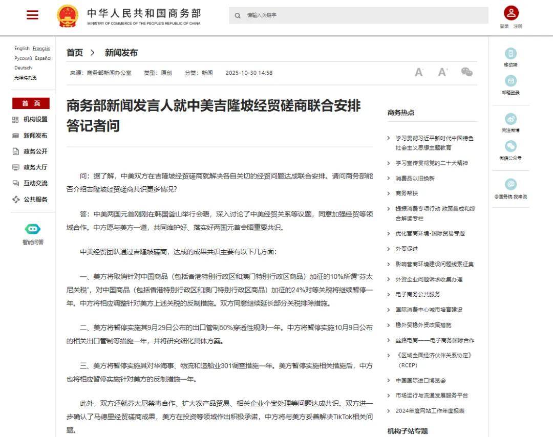 记者 辛圆 据商务部网站周四发布消息,商务部新闻发言人就中美吉隆坡经贸磋商联合安排答记者问。 记者提问称,据了解,中美双方在吉隆坡经贸磋商就解决各自关切的经贸问题达成联合安排。请问商务部能否介绍吉隆坡经贸磋商共识更多情况? 对此,发言人回应称,中美经贸团队通过吉隆坡磋商,达成的成果共识主要有以下几方面: 二是美方将暂停实施其9月29日公布的出口管制50%穿透性规则一年。中方将暂停实施10月9日公布的相关出口管制等措施一年,并将研究细化具体方案。 三是美方将暂停实施其对华海事、物流和造船业301调查措施一年。美方暂停实施相关措施后,中方也将相应暂停实施针对美方的反制措施一年。 此外,发言人提到,双方还就芬太尼禁毒合作、扩大农产品贸易、相关企业个案处理等问题达成共识。双方进一步确认了马德里经贸磋商成果,美方在投资 等领域作出积极承诺,中方将与美方妥善解决TikTok相关问题。 当地时间10月25日至26日,中美双方在吉隆坡举行经贸磋商。中国商务部国际贸易谈判代表兼副部长李成钢在磋商结束后对中外媒体记者表示,双方就妥善 解决彼此关注的多项重要经贸议题形成初步共识,下一步将履行各自国内批准程序。 李成钢介绍,过去两天 ...