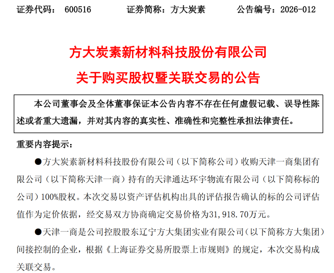 关联交易与资产收购 - 公司拟以自有资金31,918.70万元购买关联方天津一商持有的天津通达环宇物流有限公司100%股权 交易对价与评估价值一致 [1] - 交易对方天津一商为公司控股股东辽宁方大集团实业有限公司间接控制的企业 本次交易构成关联交易 但不构成重大资产重组 [3] - 标的公司通达环宇主要从事货物仓储服务、国内及国际货物运输代理、货物进出口等业务 截至2025年12月31日 其资产总额为50,592.67万元 净资产为30,221.36万元 [3] 收购的战略与运营考量 - 收购旨在优化库存管理 整合物流环节管控效率与稳定性 提升抗风险能力并降低储运及物流成本 [1] - 收购可使公司快速获得环渤海地区的物流网络、客户资源和仓储设施 强化区域市场渗透力 [3] - 公司将利用标的公司交通便利优势 将其作为产品供应华北、东北市场的主要周转地和集散地 以提高产品供应市场的速度和效率 增强市场应变力 [3] - 收购有利于公司整合物流环节 降低外部依赖风险 提高在供应链方面的管控效能 [3] 公司近期财务与业绩表现 - 公司预计2025年度实现归母净利润为6044万元到1.01亿元 同比减少45.85%到67.51% 预计扣非净利润为-1.14亿元到-1.36亿元 同比减少345.12%到393.08% [3] - 2025年度业绩预减主要原因是公司主营产品销售价格有所下降 对业绩影响较大 [4] - 2022年至2025年 公司净利润连续4年下滑 从逾10亿元盈利直线降至或不足亿元 [4] 公司治理与股价信息 - 公司董事长马卓因工作调整辞职 辞去董事长、法定代表人及董事会相关委员会职务 但将继续担任董事职务 [4] - 公司董事会选举张天军为新任董事长和法定代表人 任期至第九届董事会任期届满 [5] - 公司最新股价为5.76元 市值232亿元 [6]