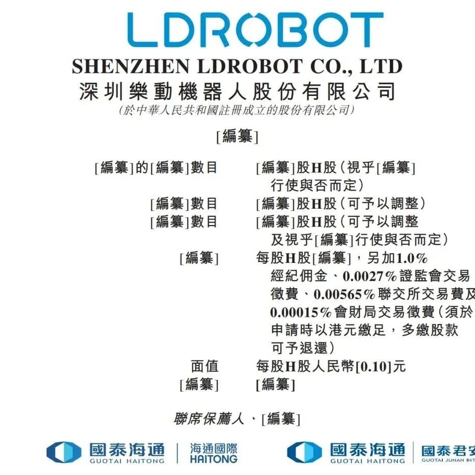 近日,深圳乐动机器人股份有限公司(简称" 乐动机器人 ")成功通过港交所主板上市聆讯,距离成为港股" 全栈式智能机器人第一股" 仅一步之遥。 这家由华中科技大学学霸创立的企业,用8年时间在机器人视觉感知领域打下江山。按2024年营收计算,乐 动机器人已是 全球最大的以视觉感知技术为核心的智能机器人公司。 2025年,搭载其视觉感知技术的智能 机器人数量超过900万台,DTOF激光雷达出货量超72万台, 稳居行业首位。 | [編纂]的[編纂]數目 | [編纂]股H股(視乎[編纂] | 行使與否而定) | | | --- | --- | --- | --- | | [編纂]數目 | [編纂]股H股(可予以調整) | [編纂]數目 | [編纂]股H股(可予以調整 | | 及視乎[編纂]行使與否而定) | 每股H股[編纂],另加1.0% | [編纂] | | | 經紀佣金、0.0027%證監會交易 | 徴費、0.00565% 聯交所交易費及 | | | | 0.00015%會財局交易徵費(須於 | 申請時以港元繳足,多繳股款 | | | | 可予退還) | 面值 | 每股H股人民幣[0.10]元 | | | [編纂] ...