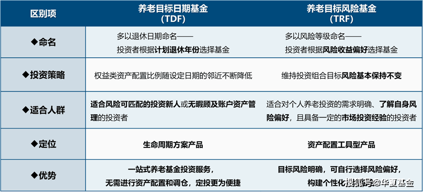 目标日期VS目标风险基金怎么选? 养老目标基金主要分为两类: 一类是目标日期基金(TDF),以投资者预期退休年份命名,如2045、2050等; 另一类是目标风险基金(TRF),通过限定权益资产仓位形成不同风险等级产品,通常分为保守、稳健、均衡、积极、进 取等类型。 | 区别项 | 养老目标目期基金 | 养老目标风险基金 | | --- | --- | --- | | | (TDF) | (TRF) | | ◆命名 | 多以退休日期命名一 | 多以风险等级命名- | | | 投资者根据计划退休年份选择基金 | 投资者根据风险收益偏好选择基金 | | ◆投资策略 | 权益类资产配置比例随设定日期的邻近不断降低 | 维持投资组合目标风险基本保持不变 | | ◆适合人群 | 适合风险可匹配的投资新人或无暇顾及账户资产管 | 适合对个人养老投资的需求明确、了解自身风 | | | 理的投资者 | 险偏好,且具备一定的市场投资经验的投资者 | | ◆定位 | 生命周期方案产品 | 资产配置工具型产品 | | ◆优势 | 一站式养老基金投资服务, | 目标风险明确,可自行选择风险偏好, | | | 无需进行资产配置和调仓,定 ...