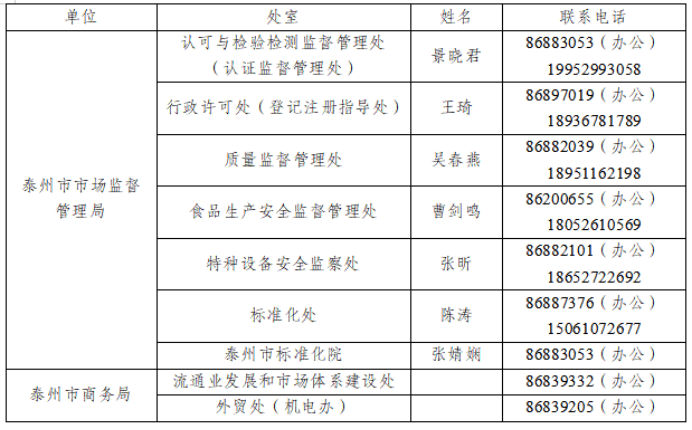 企业在内外贸市场转换过程中,常面临市场准入、资质获取、标准差异、检测认证、市场拓展等多方面 难题。为深入贯彻落实省委、省政府关于推进内外贸融合发展的决策部署,支持企业顺利实现出口转内 销、内销转出口等多渠道经营,市场监管与商务部门整合资源,推出信息引导、政策辅导、业务指导三 大服务,切实为企业纾困解难。 | 单位 | 外室 | 姓名 | 联系电话 | | --- | --- | --- | --- | | 泰州市市场监督 | 认可与检验检测监督管理处 | 景晓君 | 8683053( 办公) | | | (认证监督管理处) | | 19952993058 | | | 行政许可处(登记注册指导处) | 王琦 | 86897019 ( 办公 ) | | | | | 18936781789 | | | 质量监督管理处 | 吴春燕 | 86882039 ( 办公 ) | | | | | 18951162198 | | 管理局 | 食品生产安全监督管理处 | 曹剑鸣 | 86200655(办公) | | | | | 18052610569 | | | 特种设备安全监察处 | 张昕 | 86882101 ( 办公 ) | ...